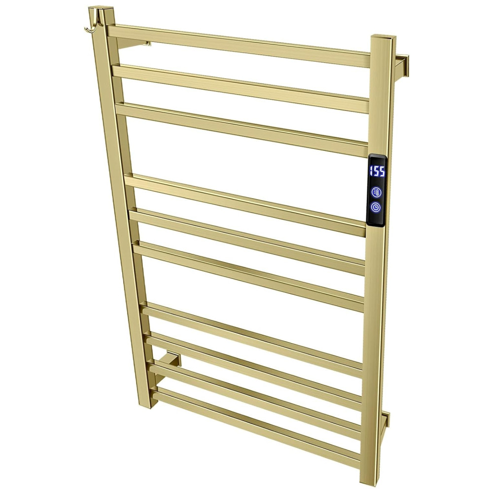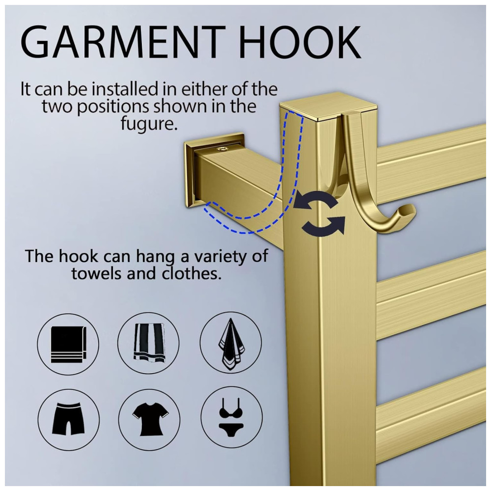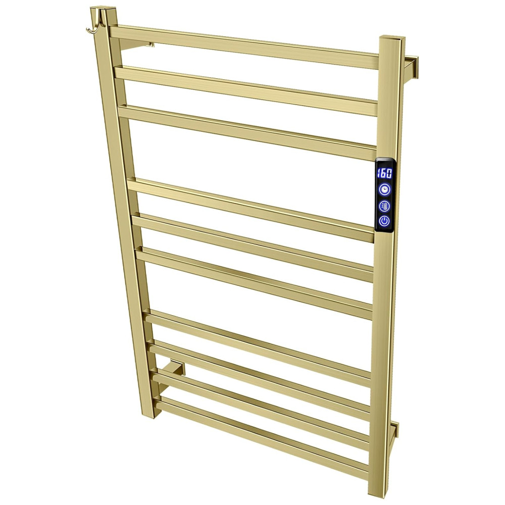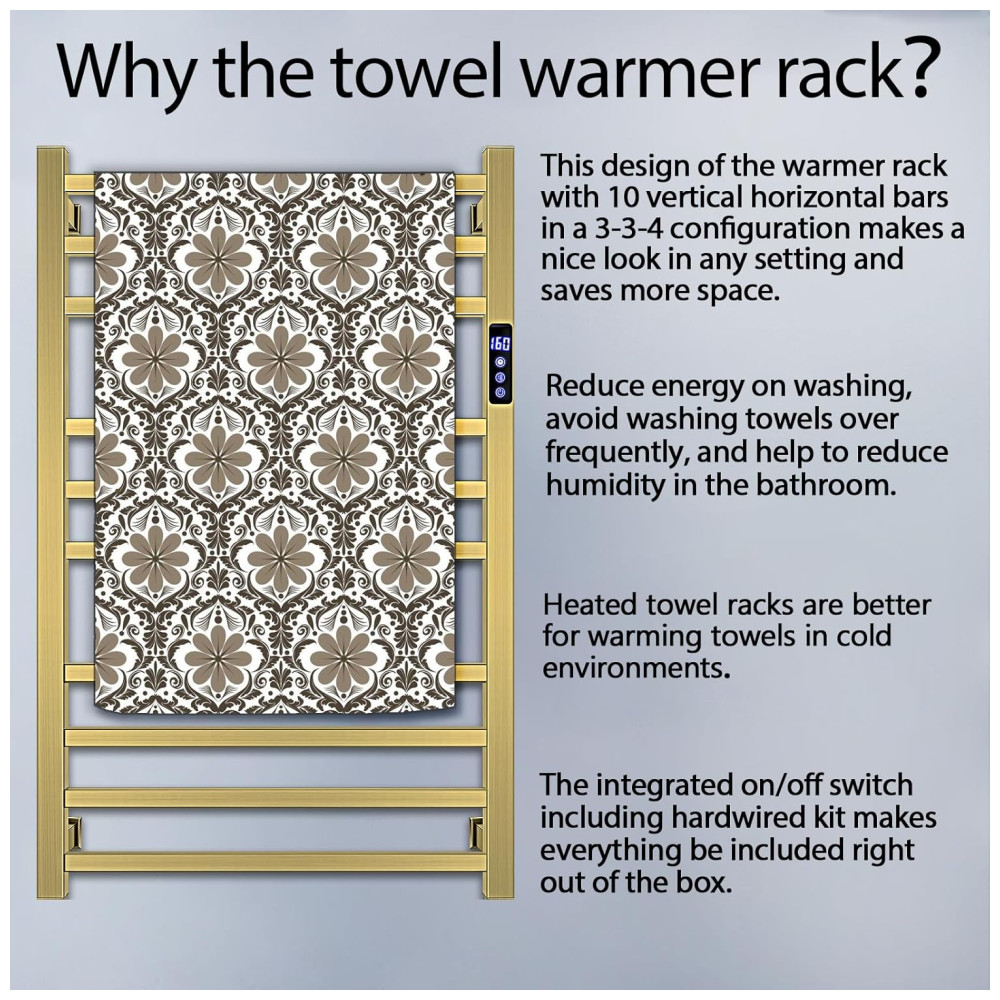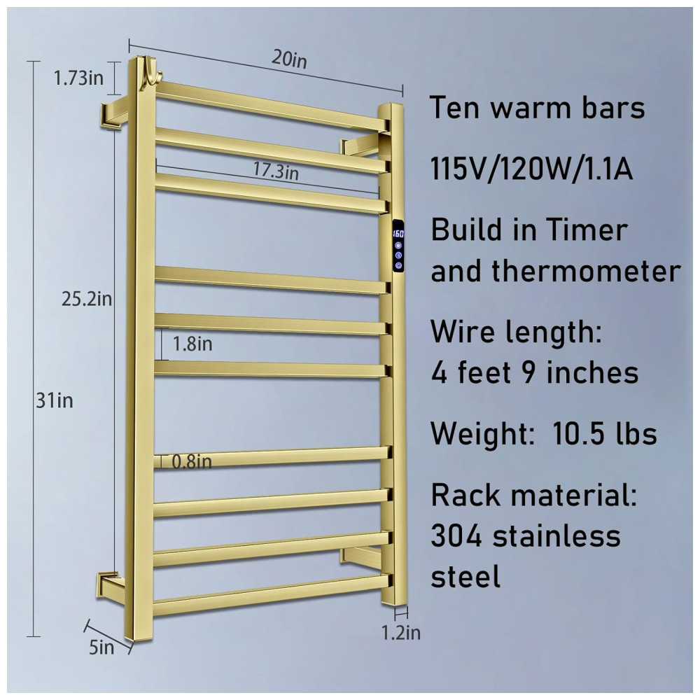 As linhas quadradas modernas em ouro escovado são feitas de aço inoxidável 304, que é fácil de limpar e tem excelente resistência à corrosão por ferrugem AQUECIMENTO RÁPIDO Potência nominal de 120 W, aquece em 14 minutos e atinge a temperatura de trabalho de 100 F160 F com base na temperatura ambiente de 68 F, 10 mantém a temperatura constante barras quadradas para pendurar distribuídas uniformemente para aumentar a densidade de calor para uma área aquecida maior OPERAÇÃO SEGURA IP56 à prova d’água e à prova de eletricidade, a proteção contra superaquecimento garante segurança contra temperatura excessiva, Vem com temporizador, pressione e segure por 1 segundo para ligar/desligar, evita que crianças abram acidentalmente, se você tiver alguma dúvida sobre o toalheiro aquecido, informe-nos, teremos prazer em atendê-lo