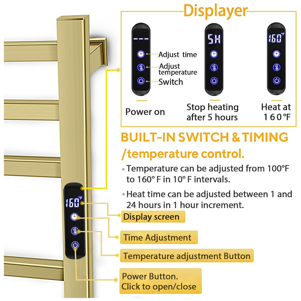 ATUALIZAÇÃO DE FUNÇÃO Gold Um temporizador visual integrado e um interruptor de controle de temperatura com display Ffahrenheit, a temperatura pode ser ajustada de 100F a 160F em intervalos de 10F, o tempo de aquecimento pode ser ajustado entre 1 e 24 horas em incrementos de 1 hora e, em seguida, desliga-se automaticamente, o que torna o produto mais fácil de usar e economiza mais energia ESPAÇO APLICÁVEL O suporte para aquecedor de toalhas Gold ajuda a reduzir a umidade em ambientes, mantendo suas toalhas com um cheiro fresco e sem odores de mofo