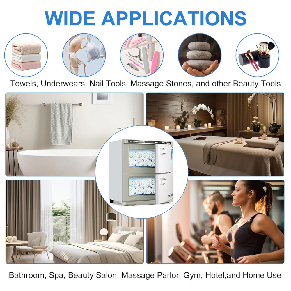 Uso Versátil: O aquecedor de toalhas Sannewstartu é ideal para aquecer toalhas faciais, toalhas de banho, roupas íntimas, ferramentas de manicure, pedras de massagem e outros acessórios de beleza. Perfeito para uso em residências, spas, banheiros, salões de beleza, hotéis, restaurantes e cozinhas, oferecendo conveniência sem limites.