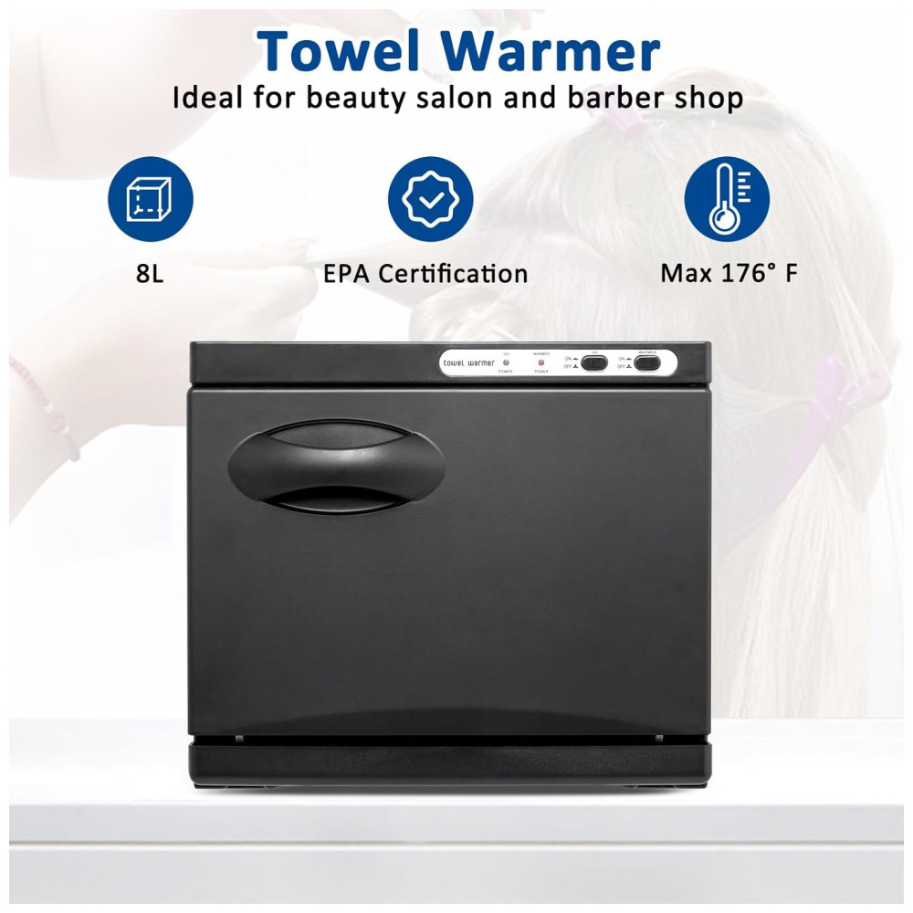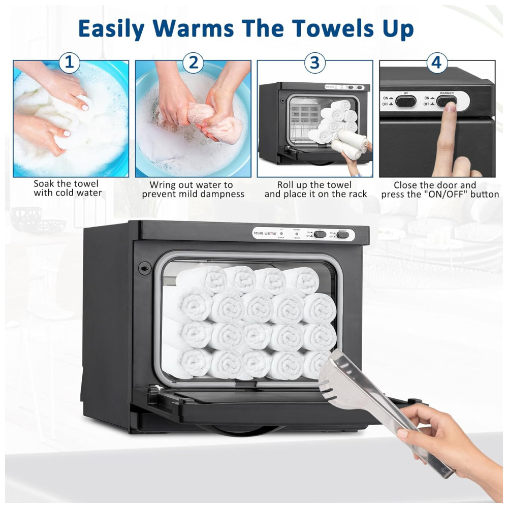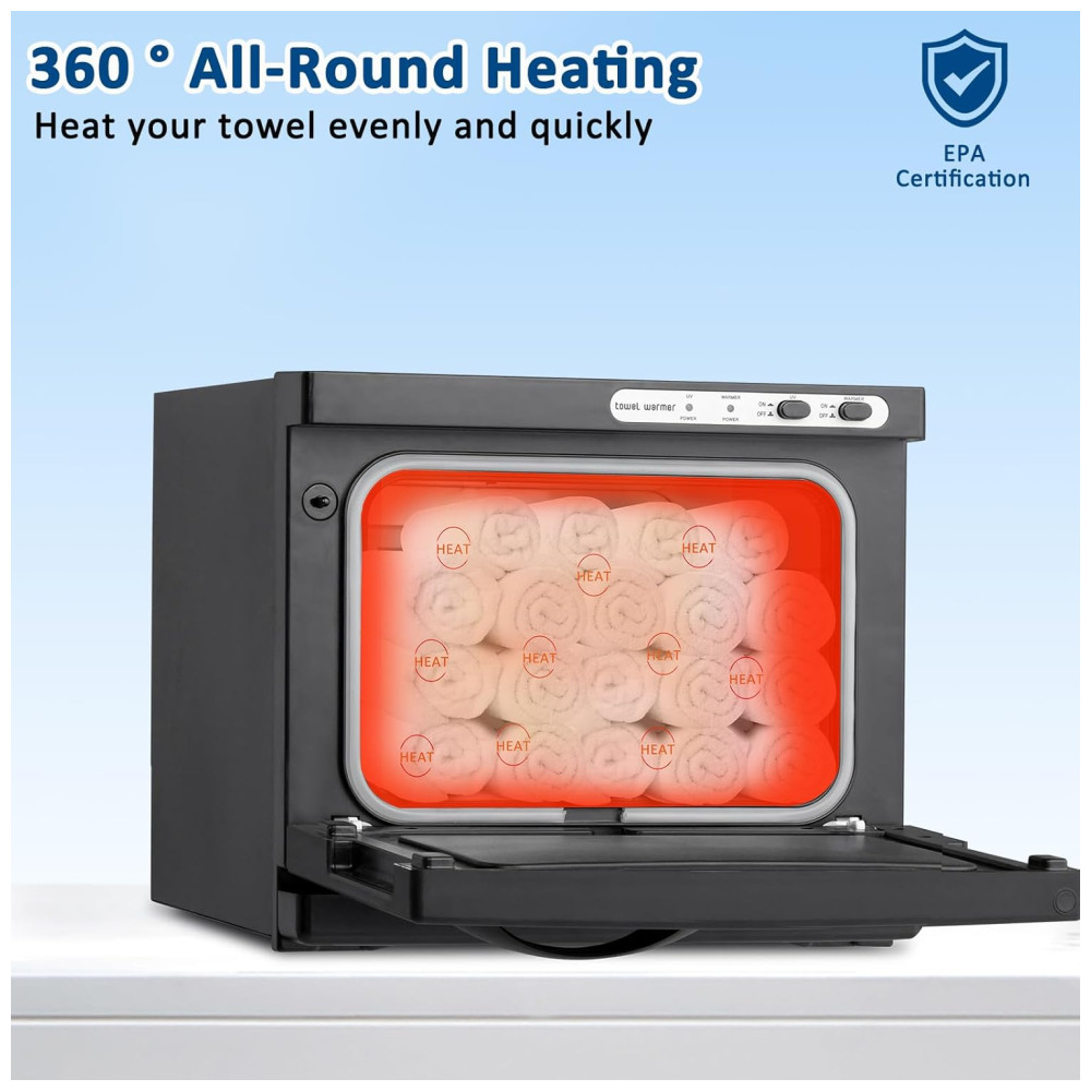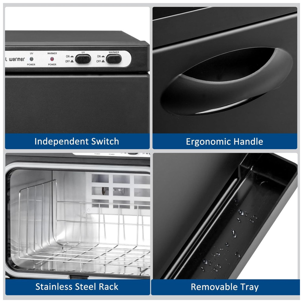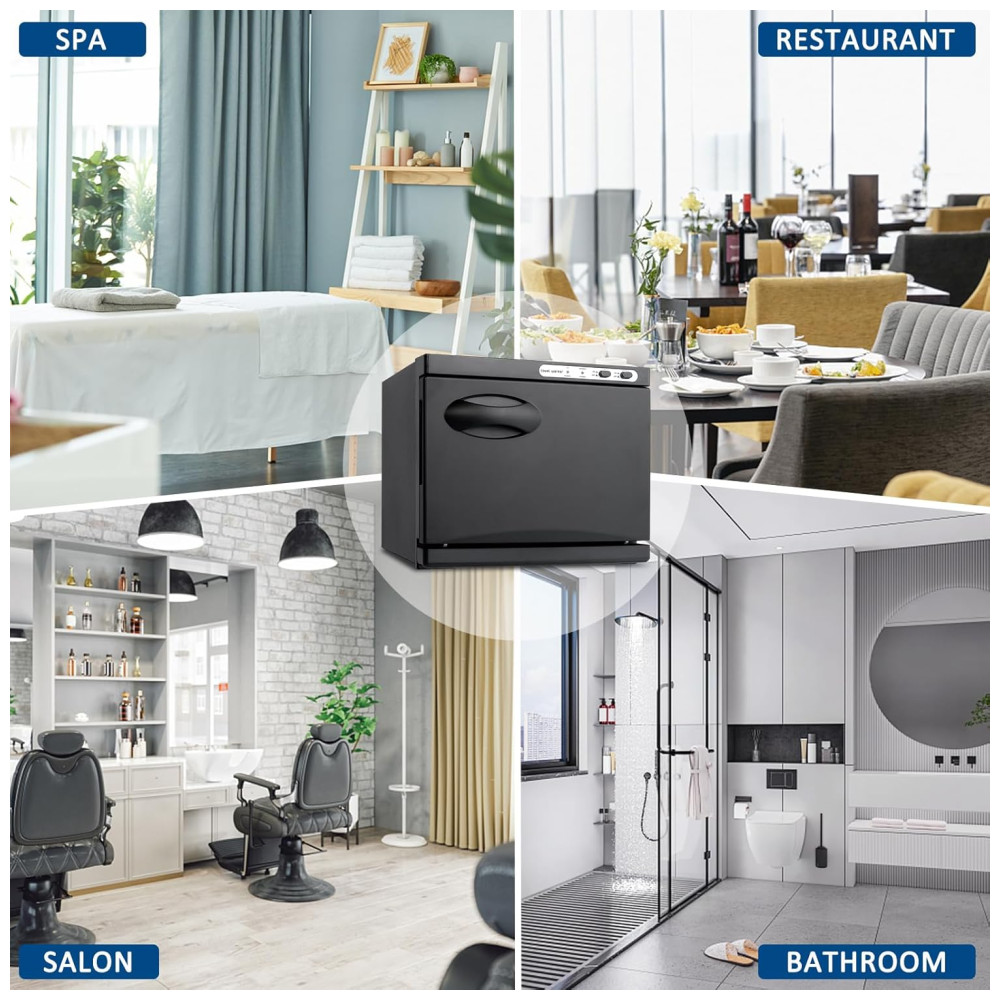 Ampla Aplicação: Além de higienizar toalhas de rosto, este gabinete aquecedor pode ser utilizado para toalhas de banho, roupas íntimas, ferramentas de manicure, pedras de massagem e outros utensílios de beleza. É a escolha ideal para famílias, hotéis, restaurantes, cozinhas, escritórios, spas, salões de beleza, academias, entre outros.