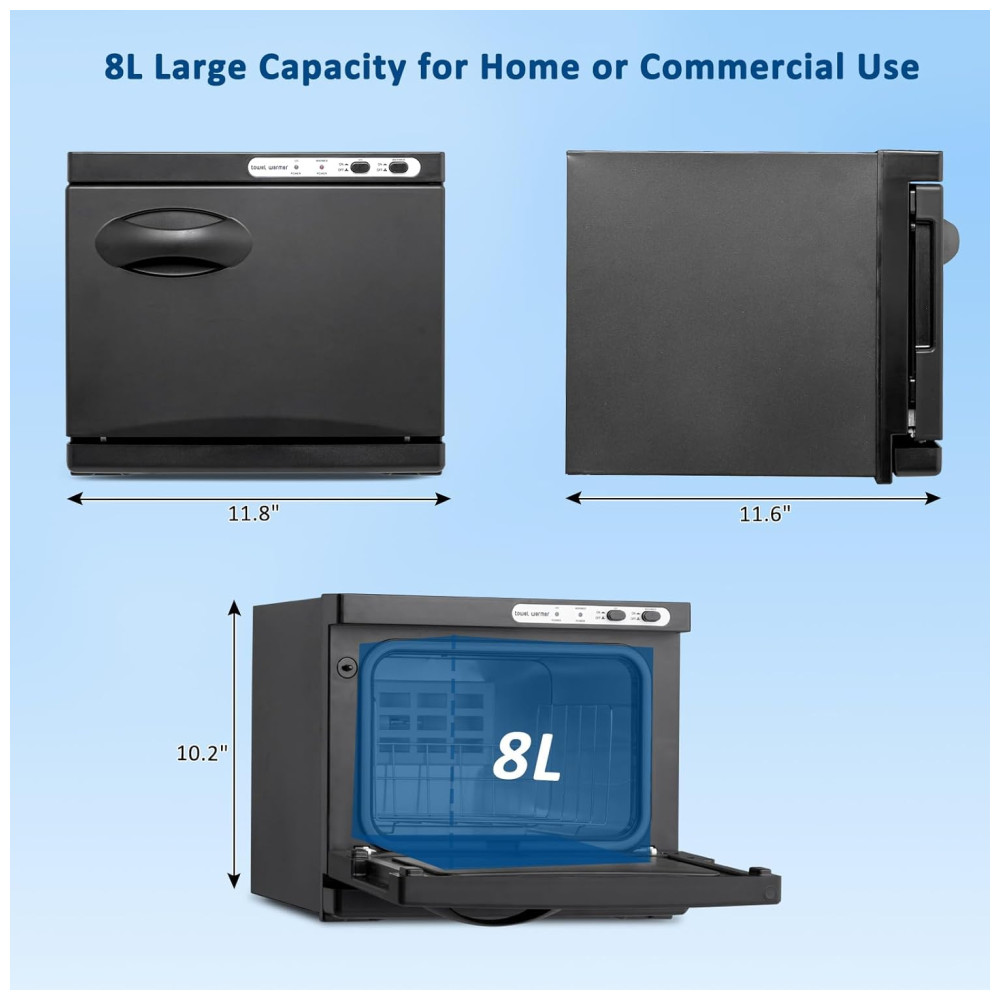 Capacidade de 8L: Este aquecedor de toalhas tem uma capacidade de 8L, sendo ideal para colocar, aquecer e higienizar aproximadamente de 10 a 15 toalhas de rosto de tamanho regular (dependendo do tamanho das toalhas). Comparado com aquecedores maiores, é mais portátil e ocupa menos espaço.