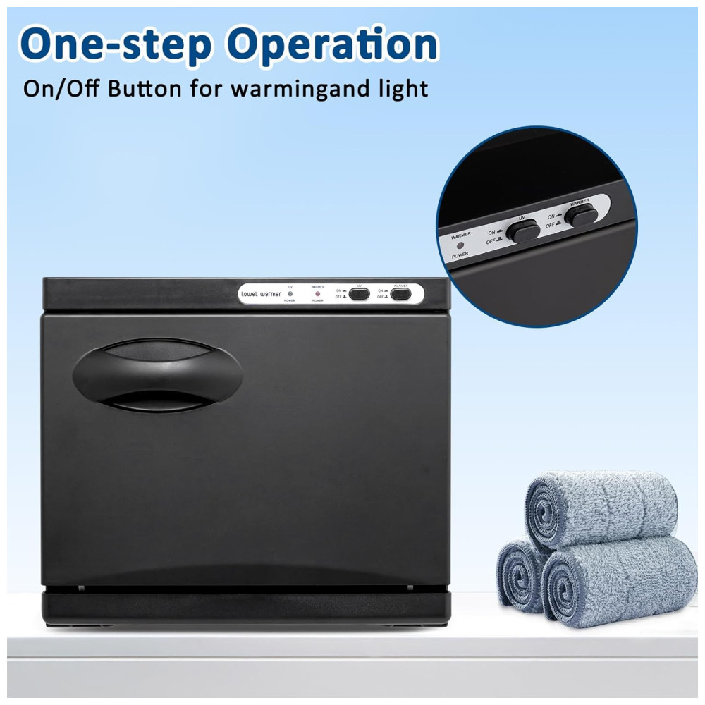 Fácil de Usar: Basta conectar à tomada de 110V, pressionar o botão ON/OFF no canto superior direito, colocar a toalha, fechar a porta suavemente. Não é necessário ajuste de temperatura, e a toalha/peça será aquecida em até 20 minutos.
