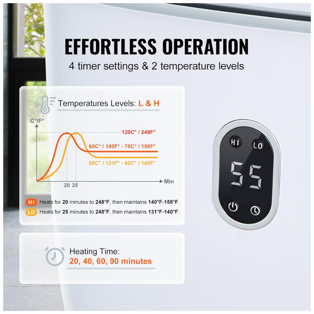 Operação Conveniente: O balde aquecedor conta com um design de operação fácil de usar. Você pode escolher livremente entre 4 configurações de timer (20, 40, 60 ou 90 minutos). Os modos de temperatura Alta e Baixa oferecem flexibilidade conforme a sua necessidade.