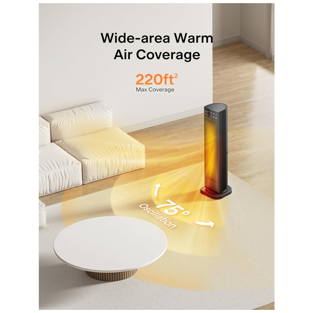 Cobertura Ampla de Aquecimento: Nosso aquecedor de torre de 58 cm pode cobrir até 20 m², combinado com uma oscilação ampla de 75°, ajuda o calor a cobrir todos os cantos do ambiente, sendo a escolha perfeita para quartos grandes e salas de estar.