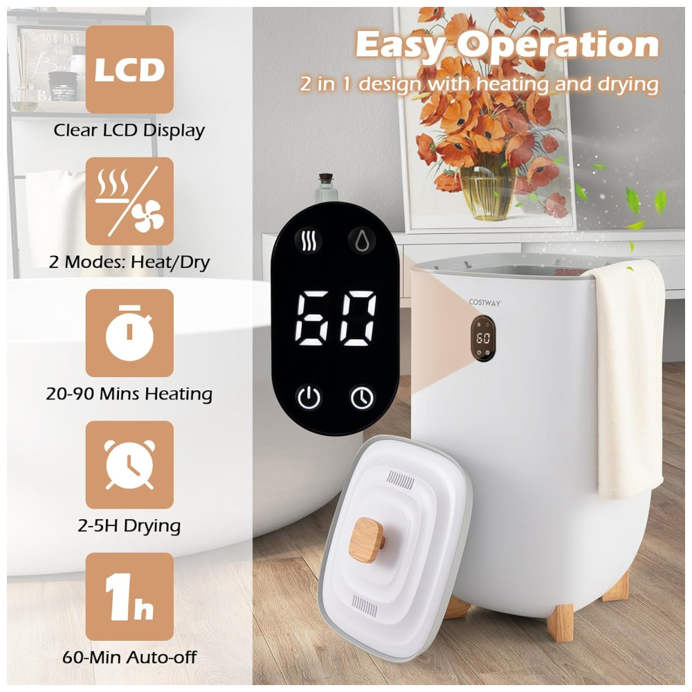 O balde aquecedor possui dois modos de funcionamento – aquecimento e secagem – e é equipado com um temporizador e visor LCD para controle preciso. O aquecimento pode ser ajustado para durar de 20 a 90 minutos, e o modo de secagem pode ser configurado para até 25 horas. As saídas de ar superiores ajudam a eliminar o excesso de umidade, e qualquer água das toalhas molhadas é coletada na bandeja inferior, protegendo o ambiente de danos.