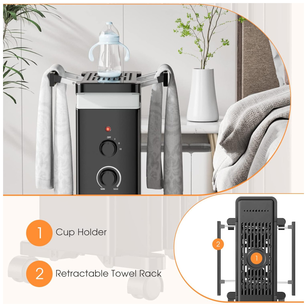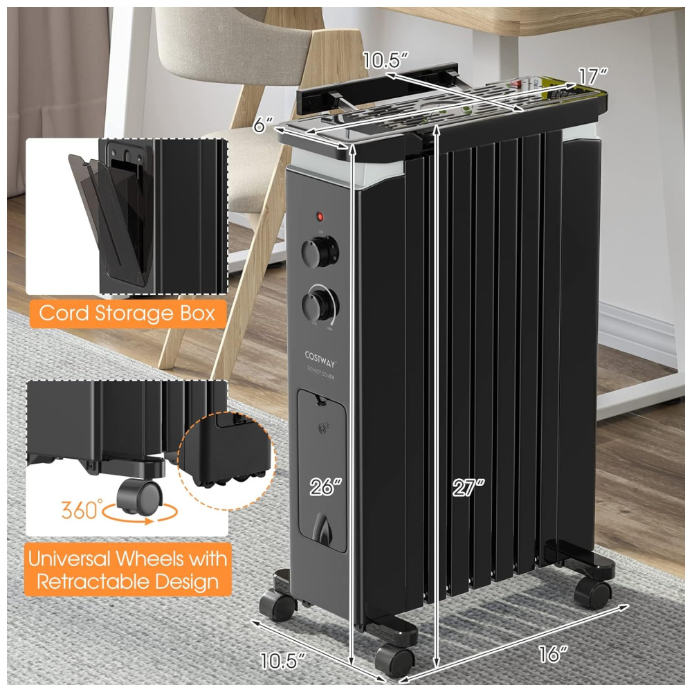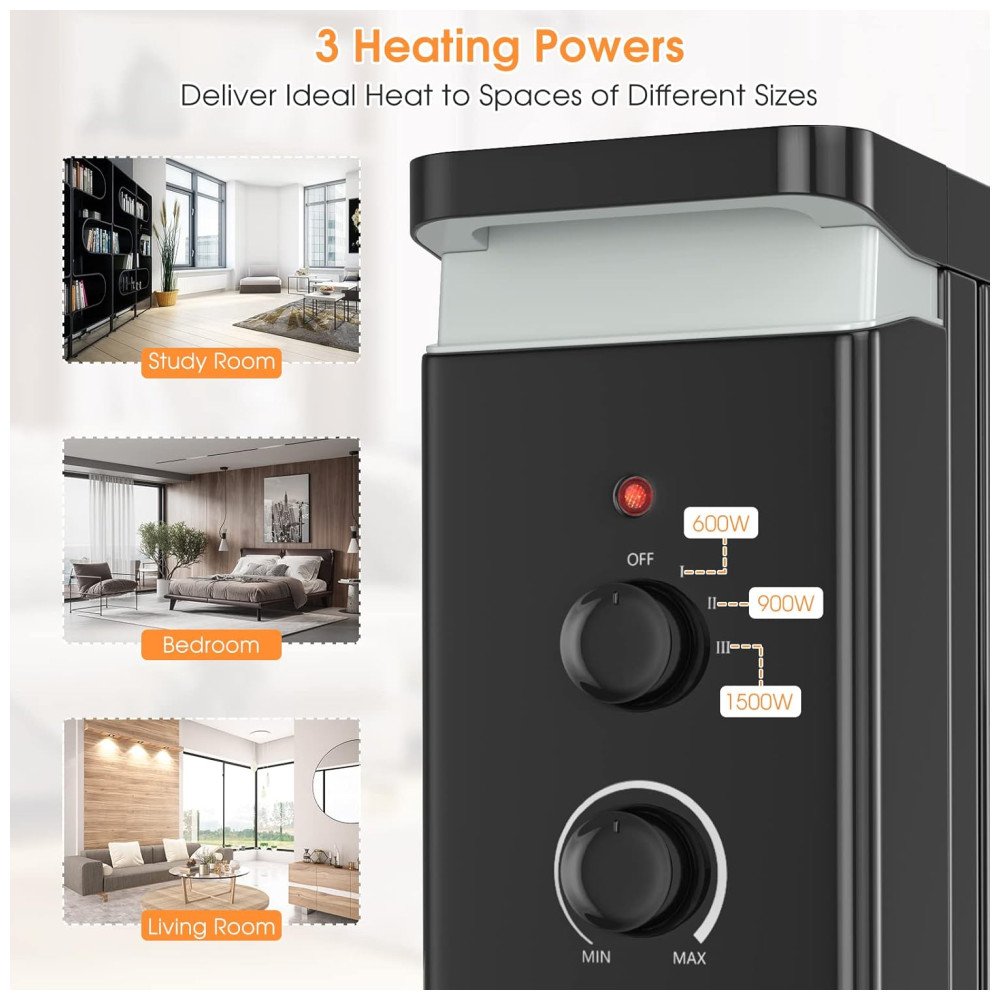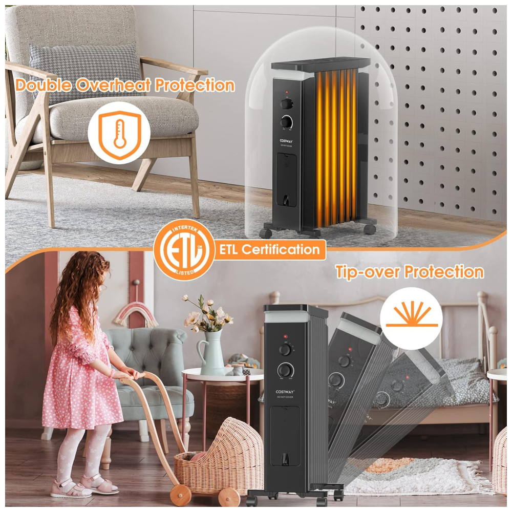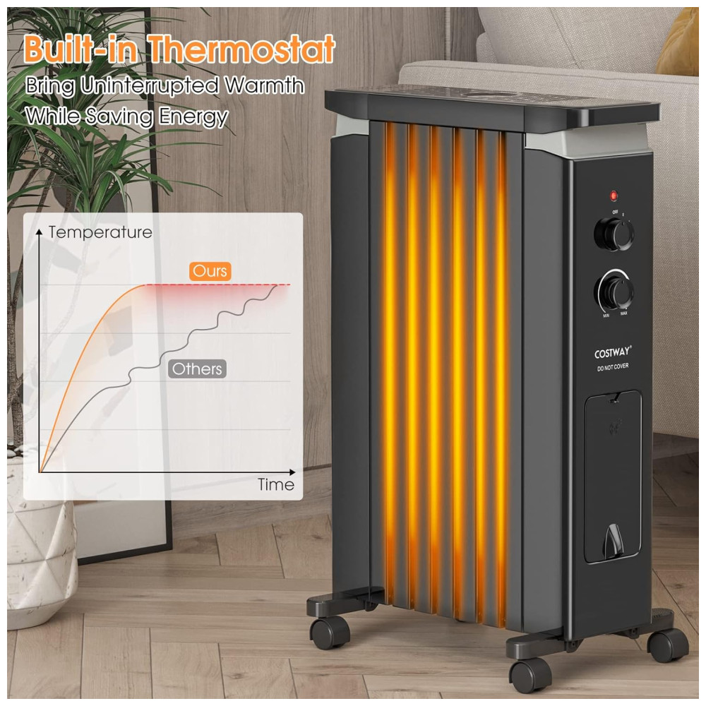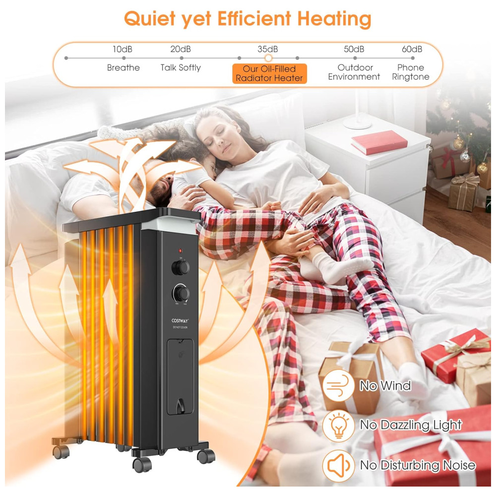 Conheça o Aquecedor de Radiador a Óleo COSTWAY, um aquecedor elétrico portátil e eficiente que proporciona calor silencioso e econômico para uso em casa ou escritório indoor (Preto).