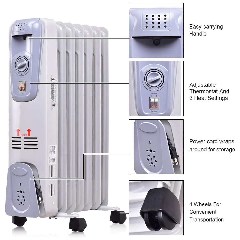 Fácil de Transportar e Armazenar: Este aquecedor a óleo possui design leve e compacto para fácil armazenamento. Com 4 rodízios universais e alça frontal, é fácil movê-lo de um cômodo para outro. Você pode enrolar o fio ao redor do aquecedor para guardar quando não estiver em uso, mantendo tudo limpo e economizando espaço.