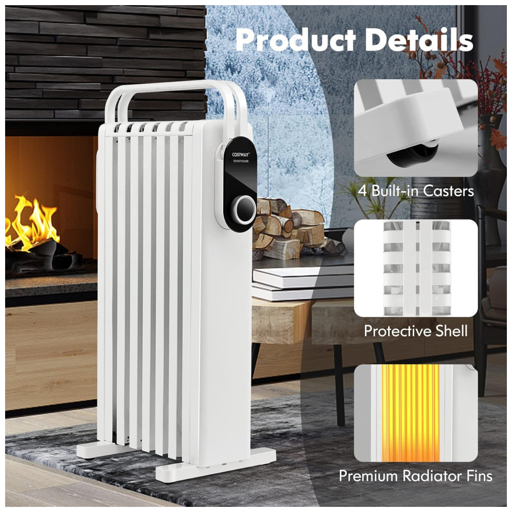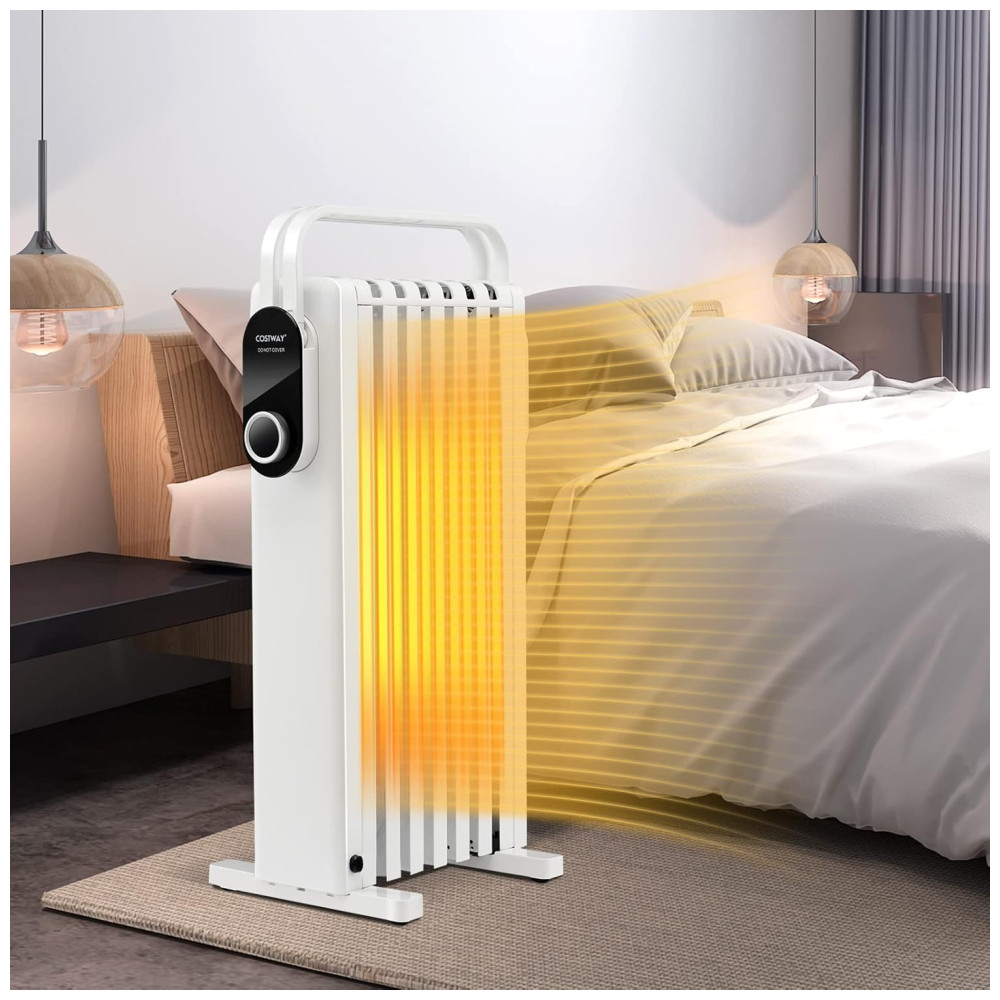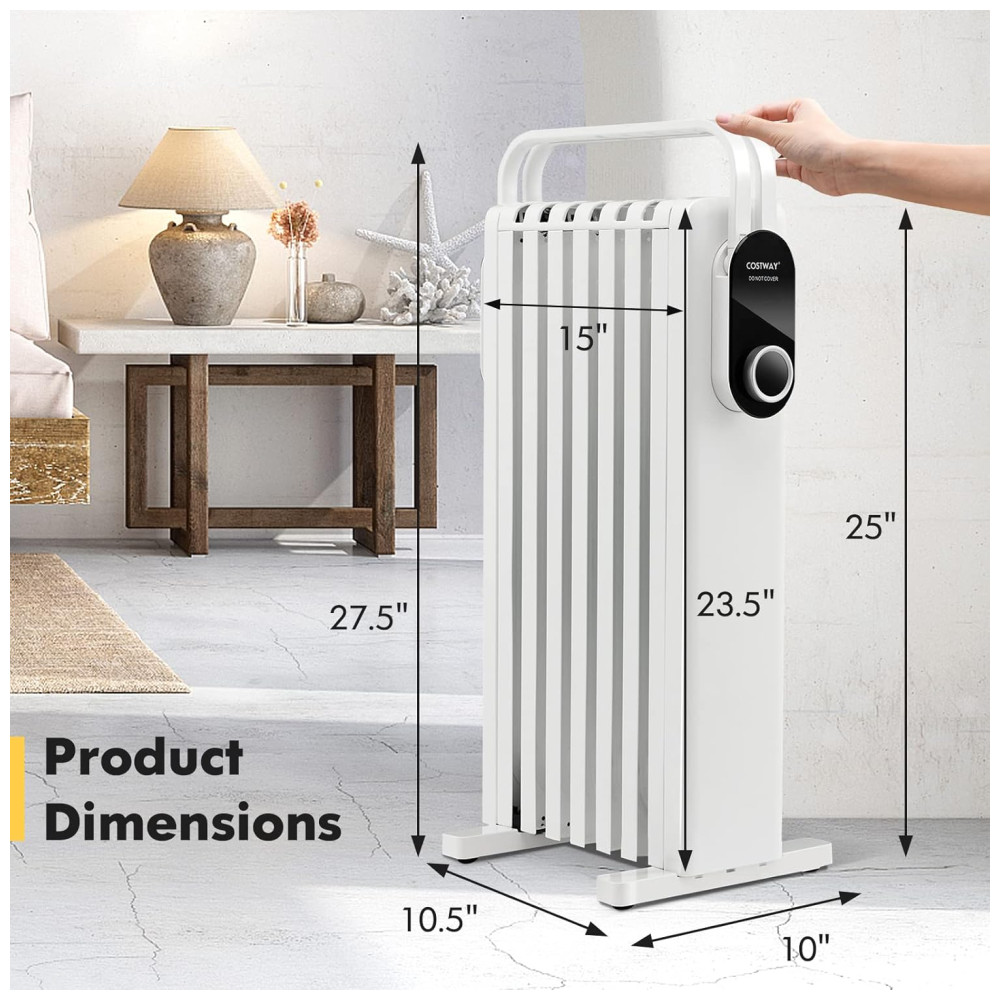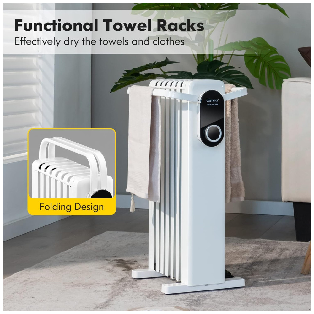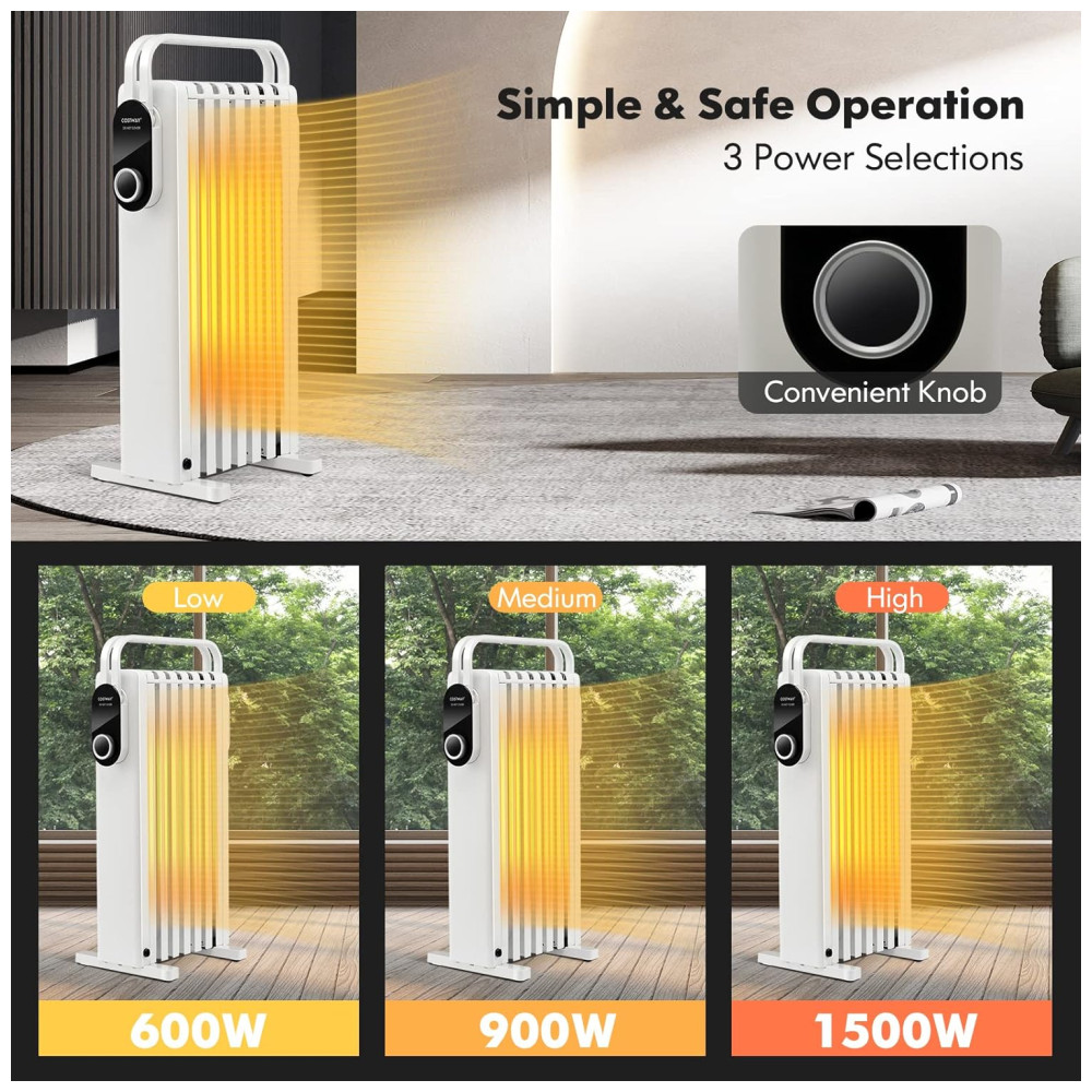 Aquecedor a Óleo COSTWAY de 1500W, Aquecedor Elétrico com Suporte Dobrável, 3 Configurações de Calor, Dupla Proteção de Segurança, Aquecedor a Óleo Portátil para Uso Interno em Casa e Escritório (Branco)