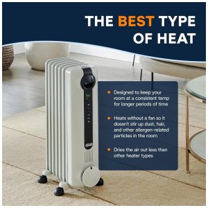 Fornece calor suave que minimiza o ar seco, criando um ambiente de respiração melhor para quem sofre de alergias, sem ventilador para levantar poeira, pólen e pelos de animais.