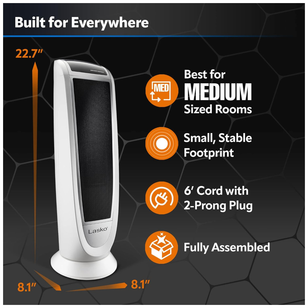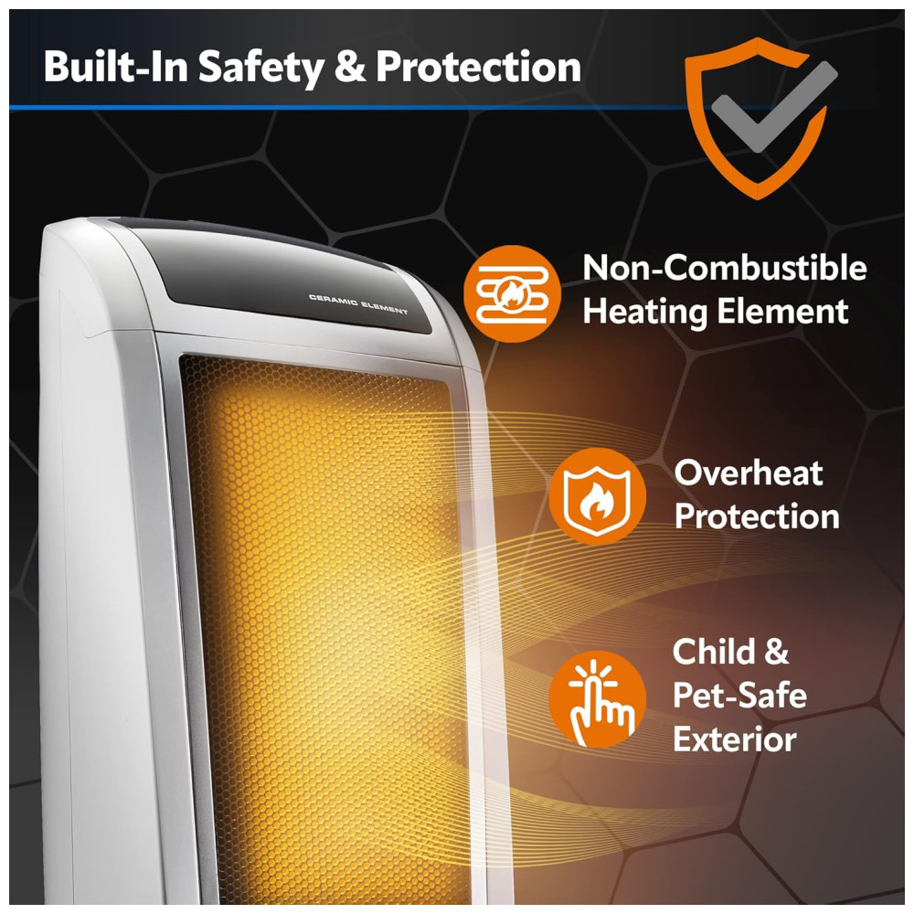 RECURSOS DE SEGURANÇA INTEGRADOS Possui proteção contra superaquecimento com um elemento cerâmico mais seguro, projetado para regular automaticamente sua temperatura de operação. A carcaça externa do aquecedor permanece fria ao toque e possui uma alça embutida para que você possa movê-lo com segurança de um cômodo para outro. Este aquecedor é listado pela ETL e está em conformidade com os padrões de segurança da América do Norte. Este aquecedor de torre tem um tamanho perfeito para o quarto, escritório em casa, sala de estar ou quase qualquer cômodo da casa.