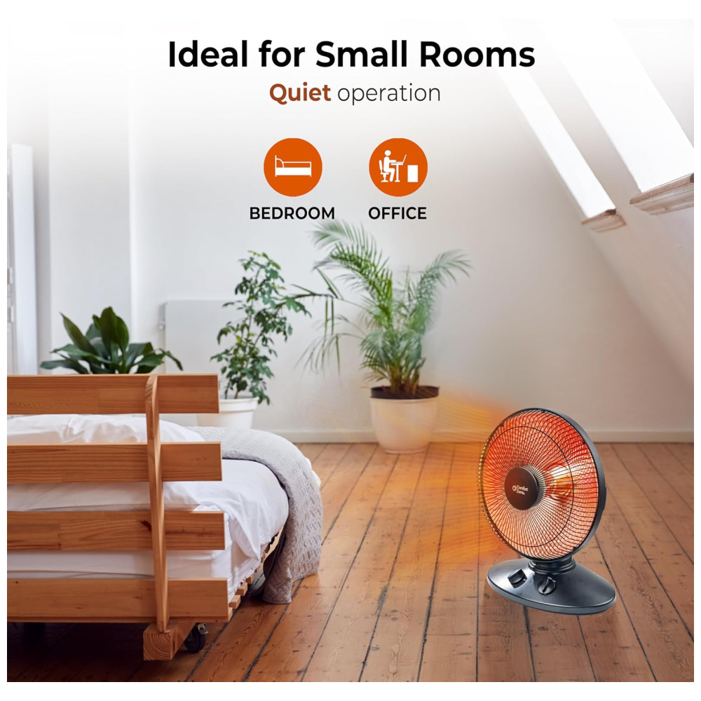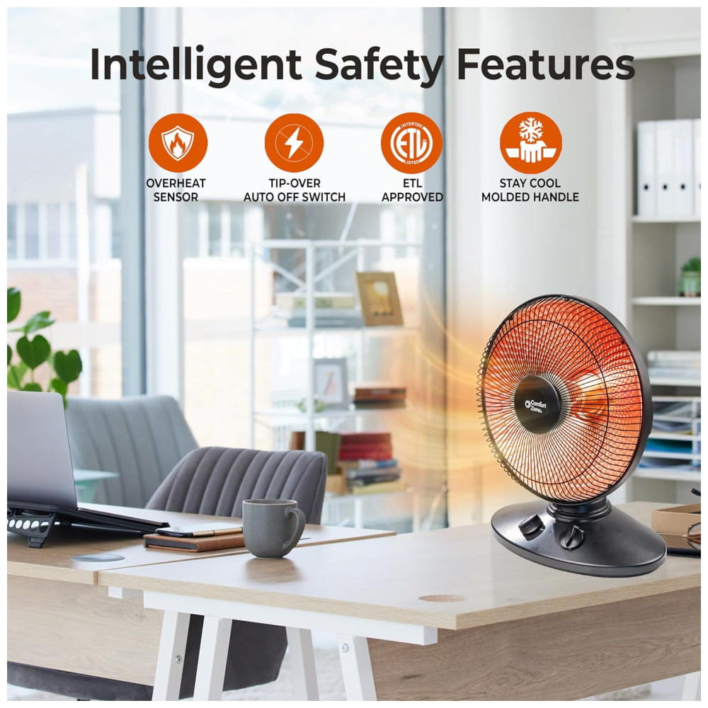 Calor Radiante Economizador de Espaço: Apesar de seu tamanho compacto, este aquecedor radiante com refletor de 35,6 cm proporciona uma impressionante saída de calor. Seu design eficiente permite que se integre perfeitamente em qualquer cômodo, proporcionando calor amplo onde quer que seja colocado. Experimente o calor reconfortante irradiando deste aquecedor compacto, porém poderoso, criando uma atmosfera aconchegante em qualquer espaço.