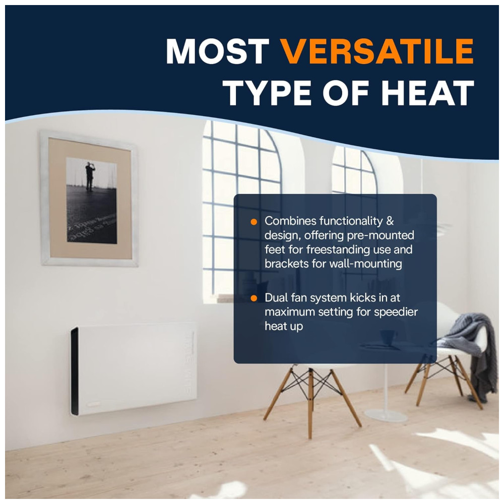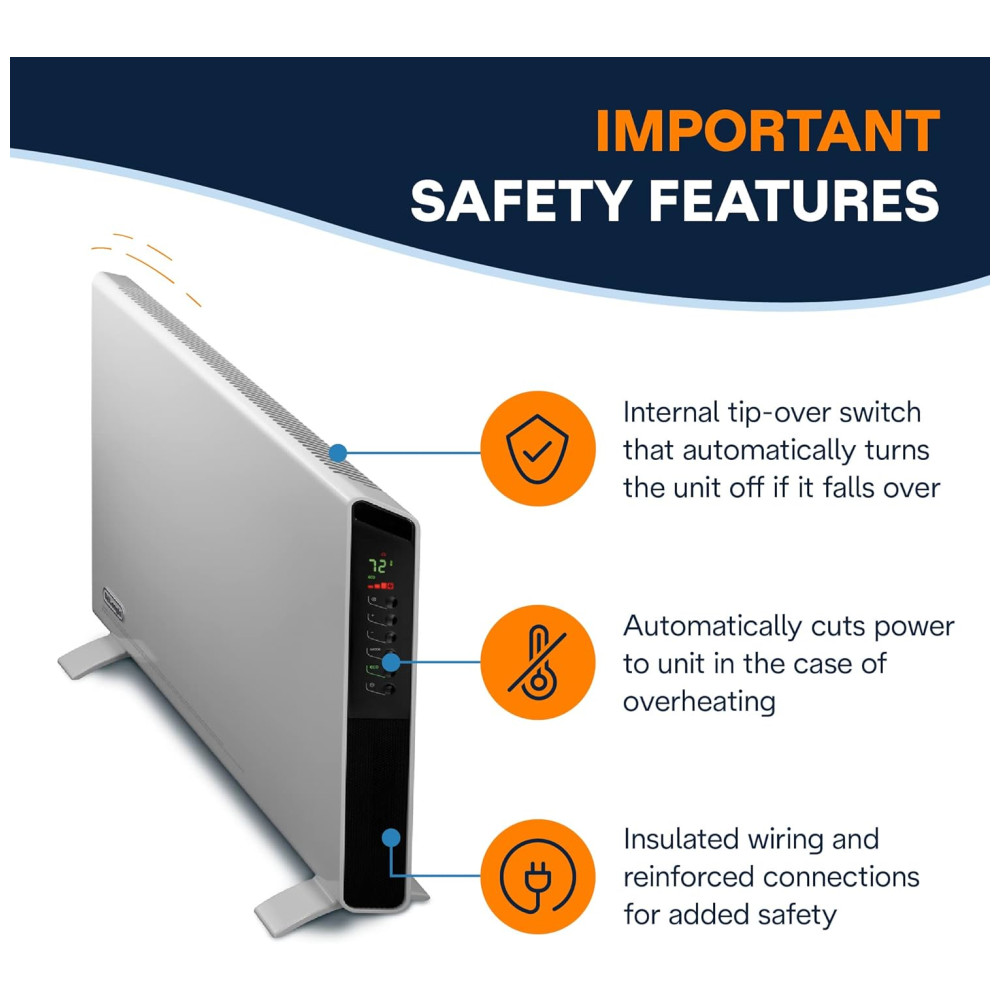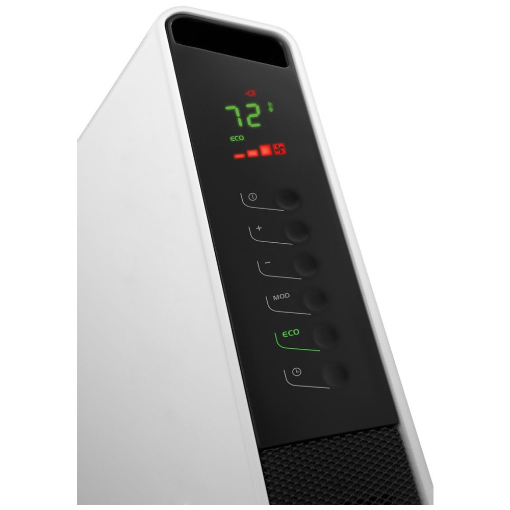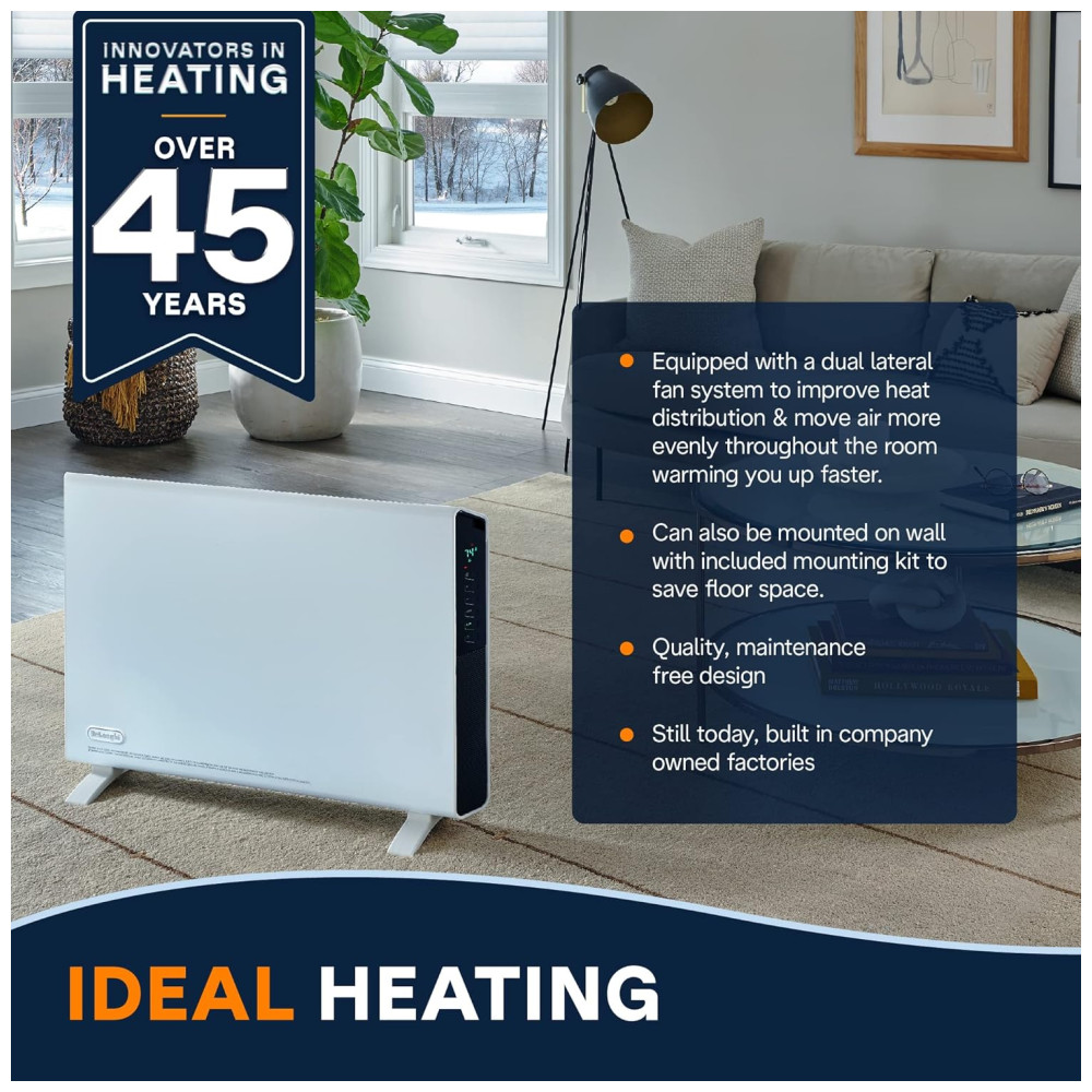 AQUECIMENTO DE QUARTO COMPLETO Inclui 1500 watts de potência de aquecimento para o conforto de toda a sala VISTA SLEEK Seja no chão ou na parede, o estilo esbelto de DeLonghi é a maneira mais bonita de se aquecer AQUECIMENTO INSTANTÂNEO sistema de ventilador duplo enche a sala de calor rapidamente MONTAGEM CONVENIENTE NA PAREDE Segura e fácil de montar em qualquer parede com o kit incluído CONFORTO PERSONALIZADO personalize suas necessidades de aquecimento com o termostato ajustável e várias configurações de calor 1500 Watts de potência em um design mais fino e elegante apenas 3 para tirar o resfriamento rapidamente de salas maiores Uso independente ou montado na parede todo o hardware incluído Sistema exclusivo de dois ventiladores Proporciona uma melhor e mais rápida distribuição de calor na sala Controles digitais Termostato ajustável, temporizador e várias configurações de calor Para salas de até 300 pés quadrados Safe Heat Tip over alarm A campainha e a unidade desligam se acidentalmente tombarem, proteção contra superaquecimento e configuração anticongelante a função ECO economiza energia automaticamente ajustar automaticamente as configurações de calor e potência para obter o calor mais confortável e econômico