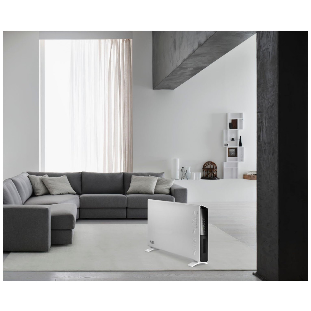 Cor branco. Este aquecedor de painel elegante e moderno da DeLonghi é perfeito para qualquer aplicação e decoração. Com aquecimento instantâneo e seu exclusivo sistema de ventilador duplo, o aquecedor DeLonghi SlimStyle aquece rapidamente as salas mais frias. Não tem espaço suficiente Com seu design fino e conveniente opção de montagem na parede, você pode virtualmente colocar esse aquecedor em qualquer lugar. É ideal para uso como aquecimento suplementar ou local no quarto, sala, escritório ou em qualquer lugar da casa. Você pode personalizar suas necessidades de aquecimento com o termostato ajustável e três configurações de aquecimento. Você pode ficar tranquilo sabendo que esse aquecedor possui um corte térmico de segurança, para não superaquecer, um interruptor interno de tombamento caso a unidade fique instável e o indicador de energia , cuidado acenda