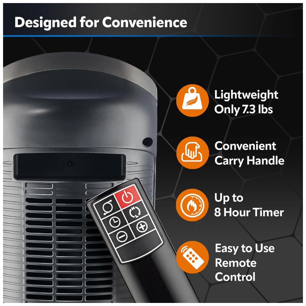 CONTROLE REMOTO: Utilize o controle remoto multifuncional para ligar/desligar o aquecedor, ajustar o temporizador, ligar/desligar a oscilação ou ajustar o termostato. Para maior conveniência, há um compartimento de armazenamento para o controle remoto na parte de trás do aquecedor, evitando que ele se perca.