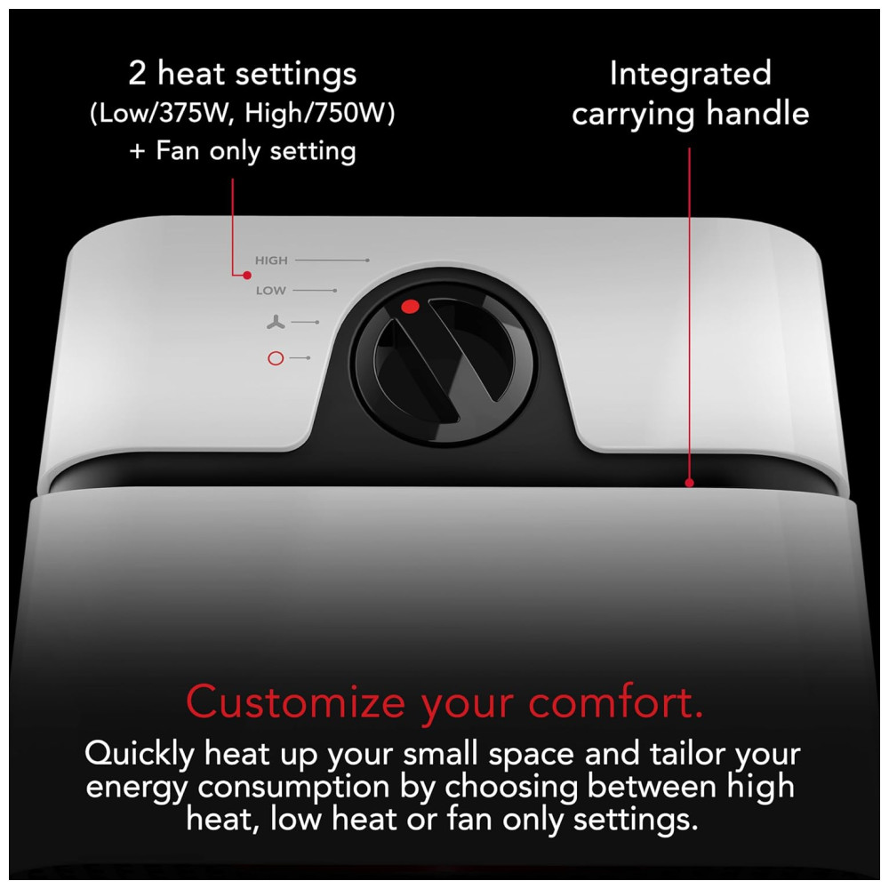 AQUECIMENTO EFICIENTE – 2 configurações de calor silenciosas (Baixo/375W, Alto/750W) e uma opção somente ventilador permitem ajustar a saída de calor e o consumo de energia conforme necessário.