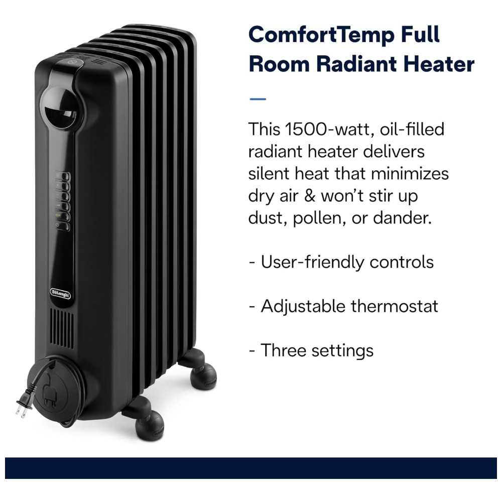 Conheça o Aquecedor Portátil a Óleo DeLonghi, 1500W, projetado para oferecer calor silencioso que minimiza o ar seco e não levanta poeira, pólen ou pelos. Personalize conforme suas necessidades com controles simples, termostato ajustável e três configurações de calor.