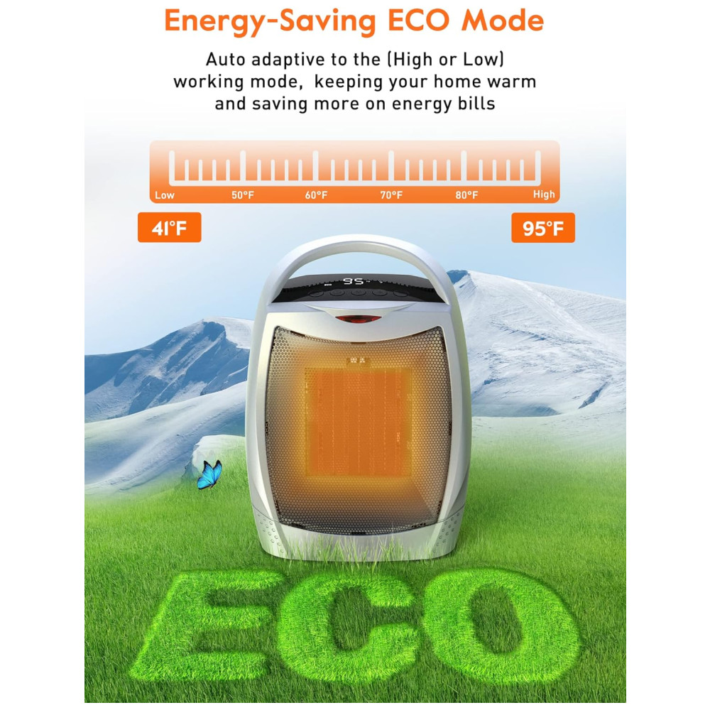 Modos Multifuncionais: Oferece níveis de aquecimento de 1500W, 750W e modo ECO (econômico) para ajustes flexíveis. O modo ECO otimiza a temperatura do ambiente e economiza energia, além de poder ser utilizado como ventilador portátil.