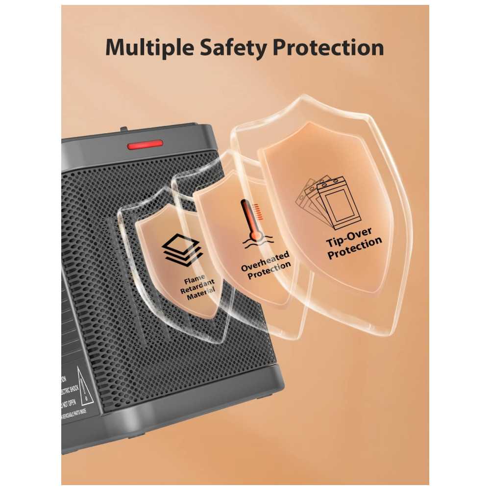 Nossos aquecedores elétricos cerâmicos incluem um interruptor de desligamento por tombamento e proteção contra superaquecimento para segurança extra, garantindo a proteção de crianças e animais de estimação. Desliga automaticamente em caso de superaquecimento acidental ou queda.