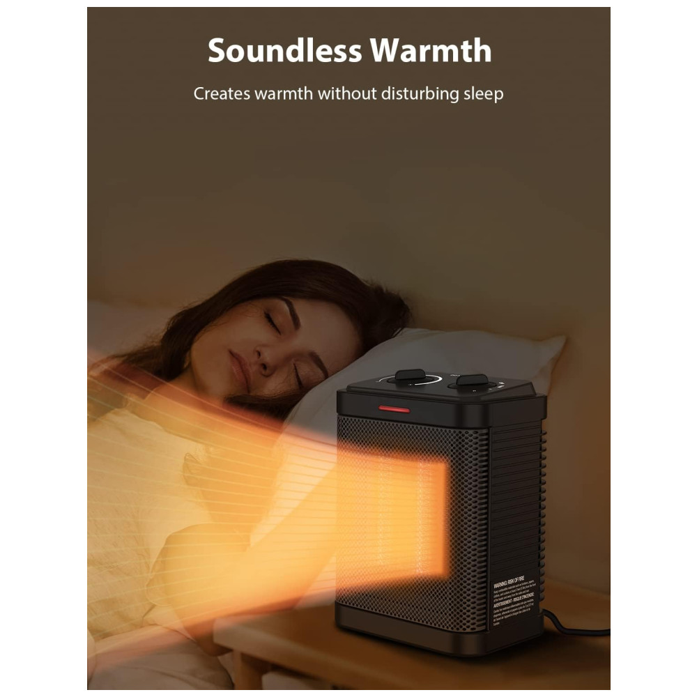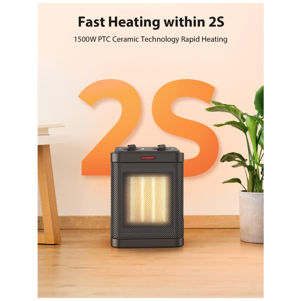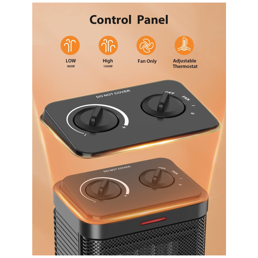 Este aquecedor de espaço possui 3 modos: Alto (1500W), Baixo (900W) e Apenas Ventilador, oferecendo opções para todos os dias frios. Um termostato ajustável embutido proporciona aquecimento rápido. A interface dos controles é intuitiva e fácil de usar, com baixo ruído para um sono tranquilo.