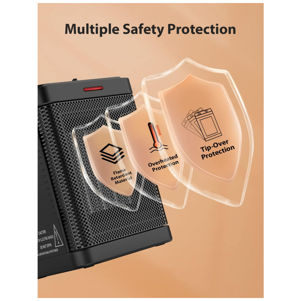 Nossos aquecedores elétricos cerâmicos incluem um interruptor de desligamento por tombamento e proteção contra superaquecimento, garantindo segurança extra para crianças e animais de estimação. Desliga automaticamente em caso de superaquecimento acidental ou queda.