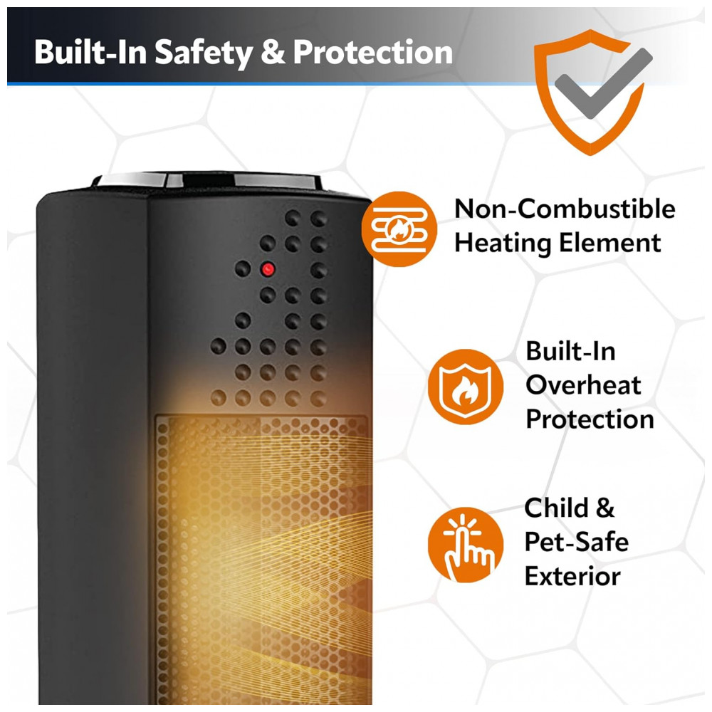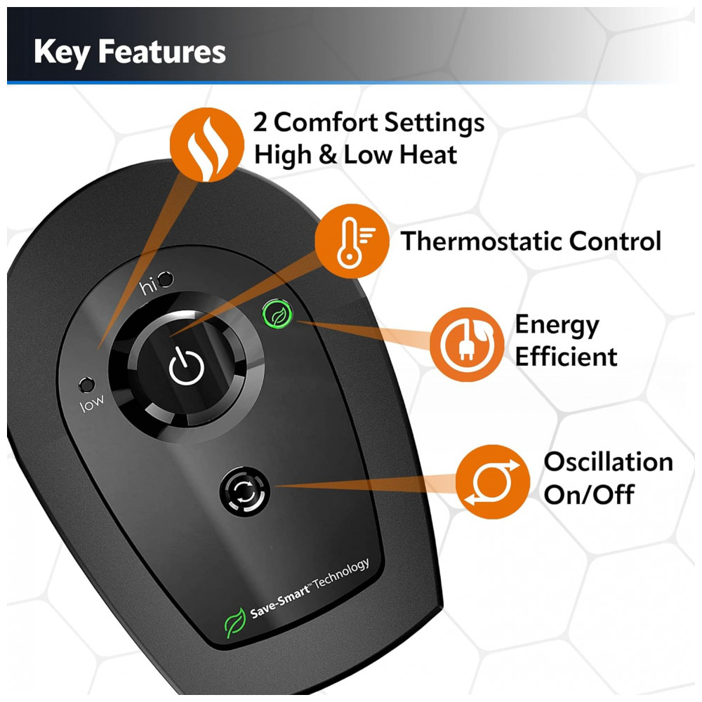 Aquecimento Rápido: Equipado com um elemento de aquecimento cerâmico eficiente em termos de energia, este aquecedor portátil possui 2 configurações de calor, Alta (1500W) e Baixa (900W), além de uma opção Auto Eco Control/Save-Smart. A oscilação opcional ajuda a dispersar o calor de maneira uniforme em todo o ambiente.