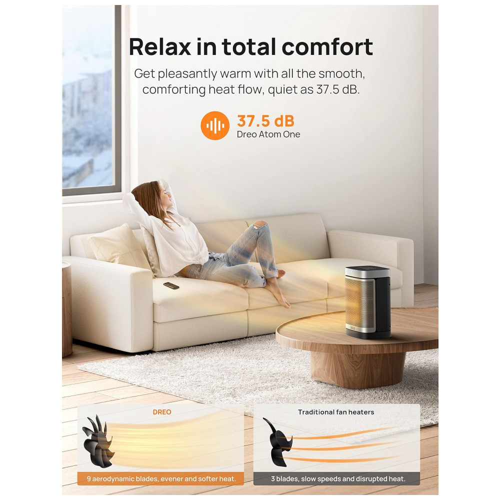 Aquecimento silencioso e rápido: Desfrute de toda a paz à noite com a estrutura de fluxo de ar exclusiva da Dreo que minimiza o ruído até 36,5 dB. Graças à eficiência térmica extremamente alta, a cerâmica Dreo 1500W PTC atingiu 24 °C em apenas 2 segundos. Juntamente com um motor DC brushless potente e silencioso, você terá um calor agradável em um piscar de olhos. Ele possui um filtro destacável e fácil de limpar para garantir que você sempre respire um ar limpo.
