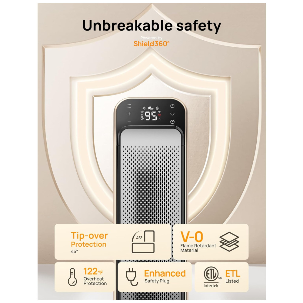 Segurança Inquebrável: Este aquecedor de ambiente interno está totalmente equipado para aquecer seu inverno com segurança. Construído com material retardante de chama V0, plugue reforçado, proteção contra tombamento de 45° e superaquecimento certificado pela ETL. Uma configuração adicional de trava infantil reduz o risco de acidentes, tornando o aquecimento mais seguro e o uso mais seguro.