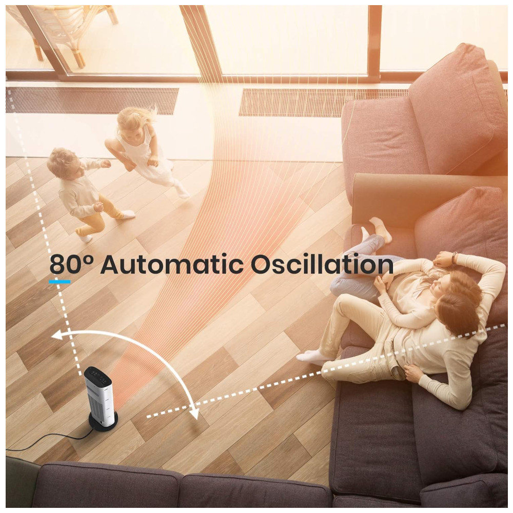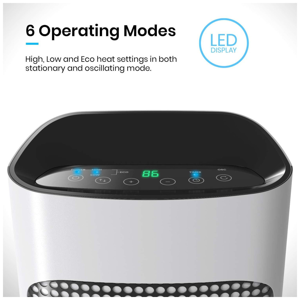 6 MODOS DE OPERAÇÃO & OSCILAÇÃO: Apresenta modos de potência de 750 Watts (baixo) e 1500 Watts (alto) e modo ECO eficiente em energia, todos em configurações estacionárias e oscilantes de 80 graus. O modo ECO ajusta inteligentemente a saída de calor para eficiência energética ideal, ajudando a manter você aquecido e a reduzir suas contas de energia.