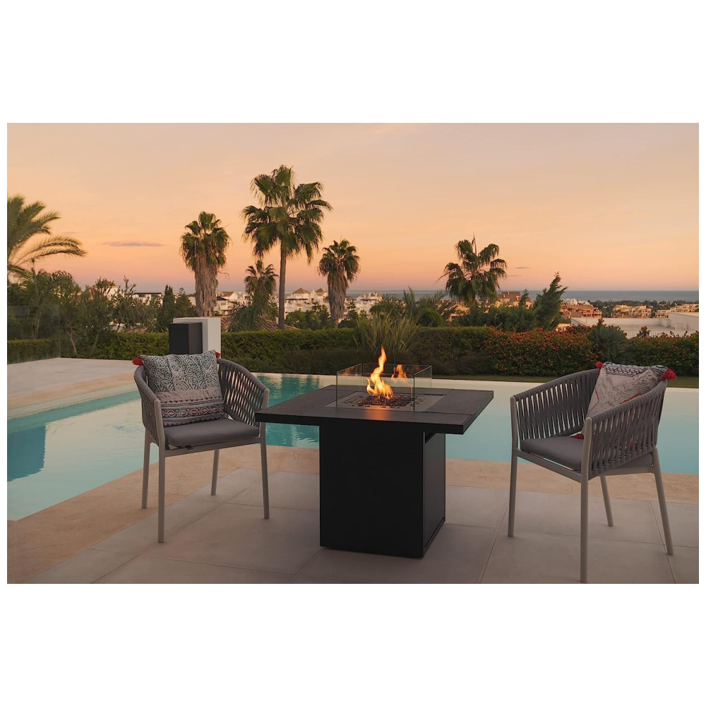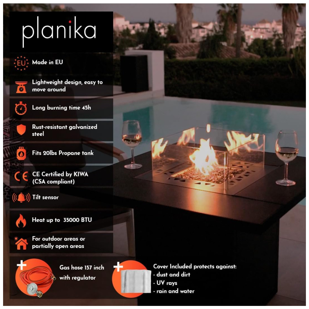 Eleve o charme do seu pátio comercial com o Aquecedor Externo a Gás GLP Estilo Mesa e Fogueira da Planika, um toque moderno em preto que combina elegância com praticidade.