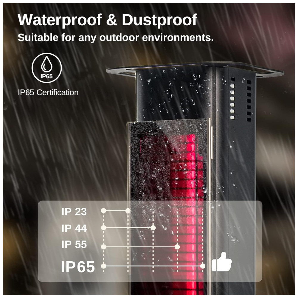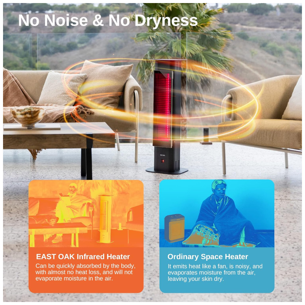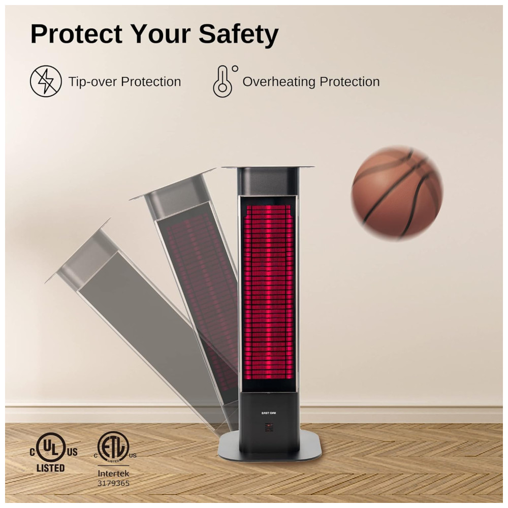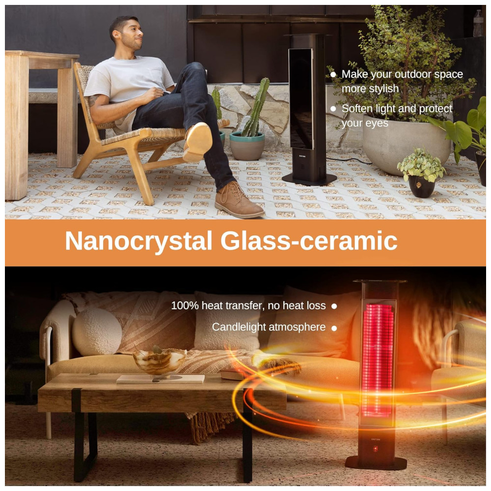 O aquecedor de ambiente EAST OAK TPH22001 tem design tipo torre, estrutura em alumínio e painel frontal em vidro nanocrystal cerâmico, que permite emissão total de calor sem dispersão. Utiliza tecnologia infravermelha ULG para aquecimento instantâneo e direto do corpo, com sistema silencioso, sem ventilador ou ressecamento do ar. Oferece três potências: 1000W, 1200W ou 1500W, selecionáveis por controle remoto (alcance até 5 m; não inclui pilhas AAA), e apresenta cobertura efetiva entre 4-6 m². Conta com certificação internacional ETL e UL, proteção contra superaquecimento e tombamento, além de selo IP65 à prova d’água para uso externo, inclusive em chuva ou neve. A estrutura inclui alça para transporte, cabo de 2,1 m e base estável para ambientes externos ou internos, como varanda, jardim, garagem e restaurante.