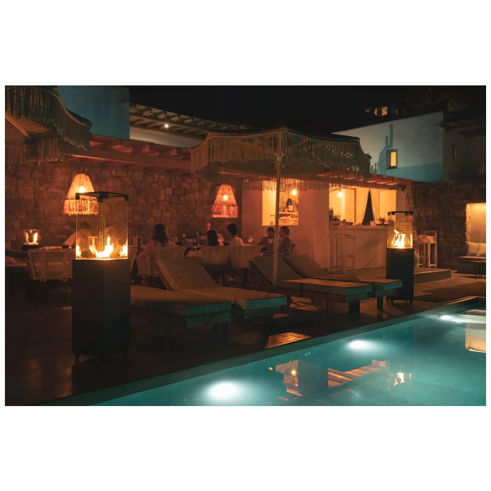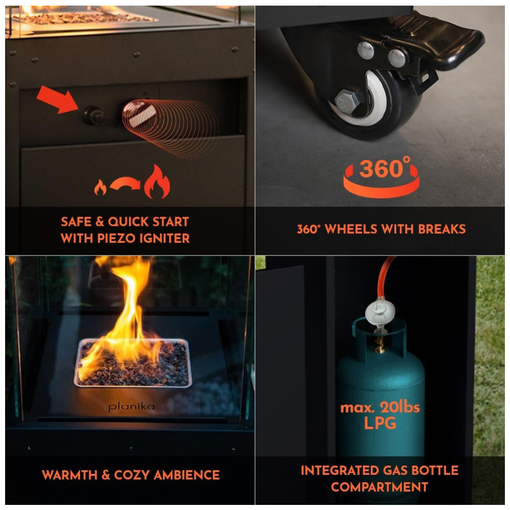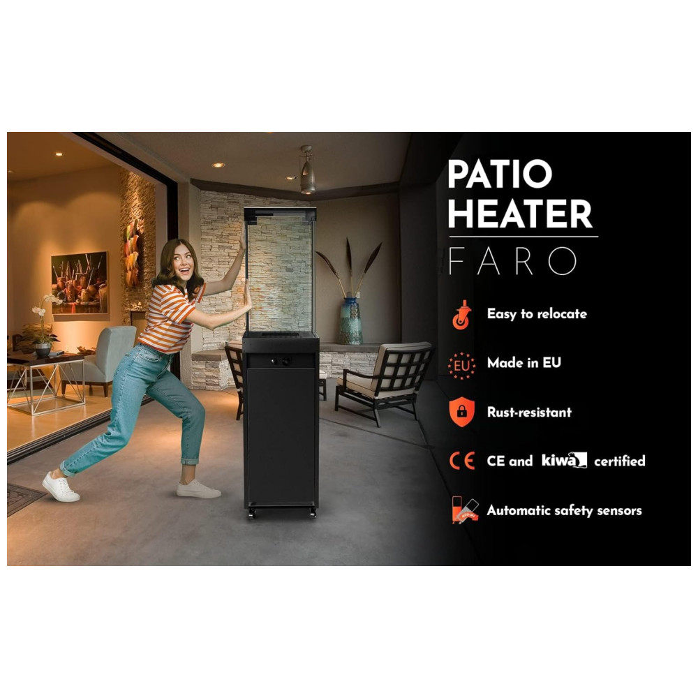 Montar e desfrutar deste aquecedor é simples e rápido. Com rodas e proteções de vidro à prova de vento, você pode facilmente movê-lo pelo seu espaço e garantir sua estabilidade. Além disso, o Faro é equipado com recursos de segurança avançados, incluindo desligamento automático em caso de inclinação ou queda, sensor termoelétrico que interrompe o fornecimento de gás se a chama se apagar e um botão de ignição protegido contra acesso não autorizado.