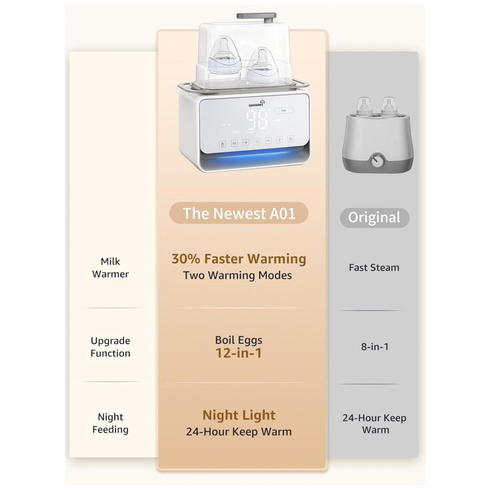 O Aquecedor de Mamadeira GROWSNY oferece aquecimento rápido a vapor, banho-maria nutritivo, mantém quente por 24 horas, descongela, aquece alimentos, ferve ovos, esteriliza, possui luz noturna, temperatura ajustável, cesto antiescaldo, timer ajustável e grande capacidade. Recentemente atualizado com a função de Cozimento de Ovos, este versátil aquecedor de mamadeira atende às necessidades de toda a família, especialmente pais de gêmeos! Com um sensor de temperatura inteligente aprimorado, o aquecedor de mamadeira GROWSNY aquece o leite 30% mais rápido do que outros, garantindo a temperatura ideal, reduzindo o tempo de espera e acalmando seu bebê mais rapidamente. Com desligamento automático para segurança, este aquecedor de leite materno é indispensável para pais ocupados que precisam de soluções rápidas e confiáveis! Escolha o Aquecimento a Vapor para um aquecimento rápido e seguro de fórmulas ou papinhas, ou o Aquecimento NutriWater para aquecer suavemente o leite materno, preservando os nutrientes. Troque facilmente entre os modos com um botão para atender todas as suas necessidades de alimentação e tornar sua rotina diária mais fácil. A função de manter quente por 24 horas do aquecedor de mamadeira garante que o leite permaneça na temperatura perfeita durante toda a noite. Com display de LED e luz noturna integrada, as mamadas da meia-noite se tornam muito mais tranquilas! Confiado por mais de um milhão de pais, o aquecedor de mamadeira GROWSNY é projetado para mais do que apenas aquecer o leite materno. Com uma função de esterilização integrada para manter as mamadeiras e acessórios higiênicos e um timer pré-definido para preparar o leite com antecedência, esta solução tudo-em-um economiza seu tempo, dinheiro e espaço no balcão!
