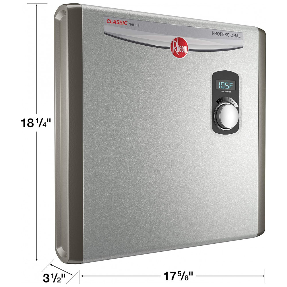 O Rheem RTEX-24 é um aquecedor de água tankless elétrico de 24 kW projetado para fornecimento contínuo de água quente em residências inteiras, com taxa de fluxo de 5,9 galões por minuto (GPM). Opera em 240V com display digital LED ajustável em incrementos de 1°C de 27°C a 60°C, atendendo demandas simultâneas em múltiplos pontos de uso conforme temperatura da água subterrânea local. Indicado para instalação em parede, requer serviço elétrico de 200 AMP e 3 disjuntores duplos de 40 AMP, economizando espaço sem necessidade de ventilação.