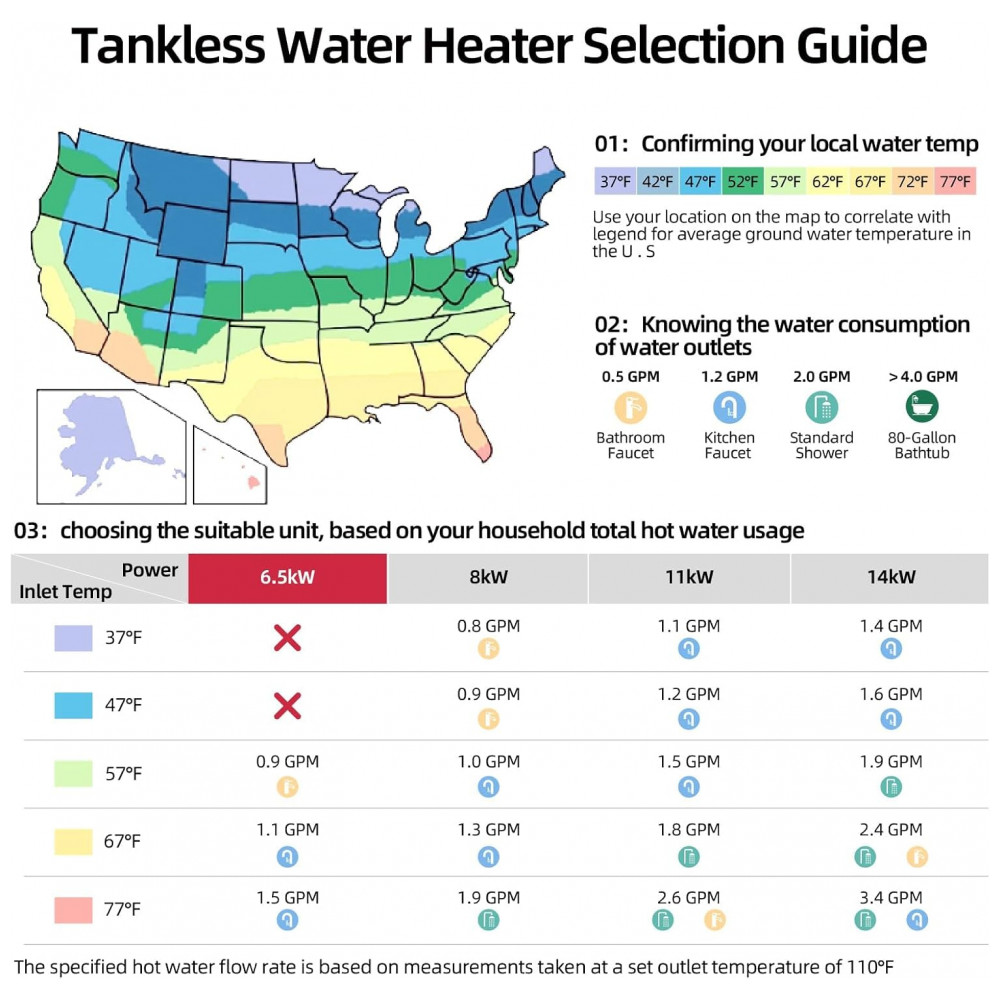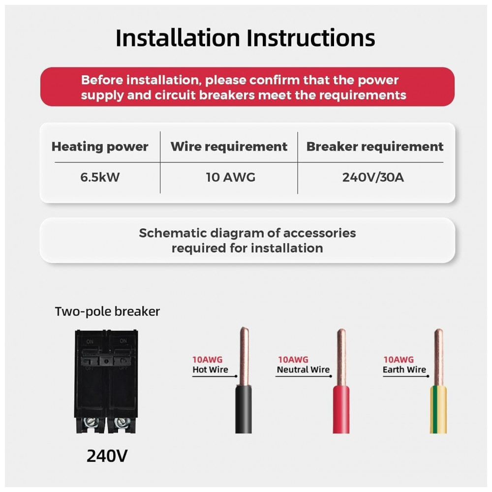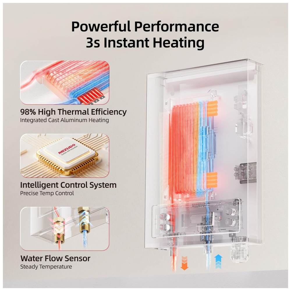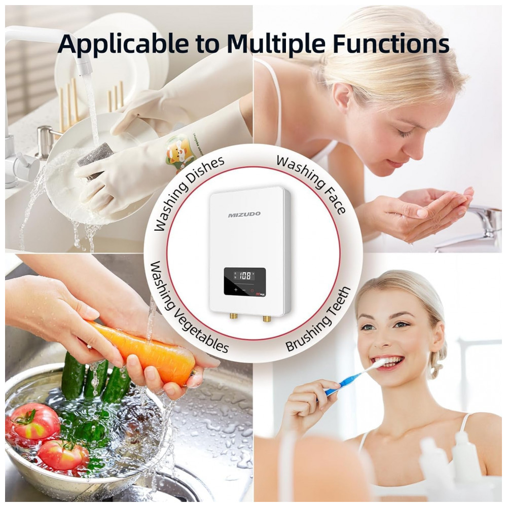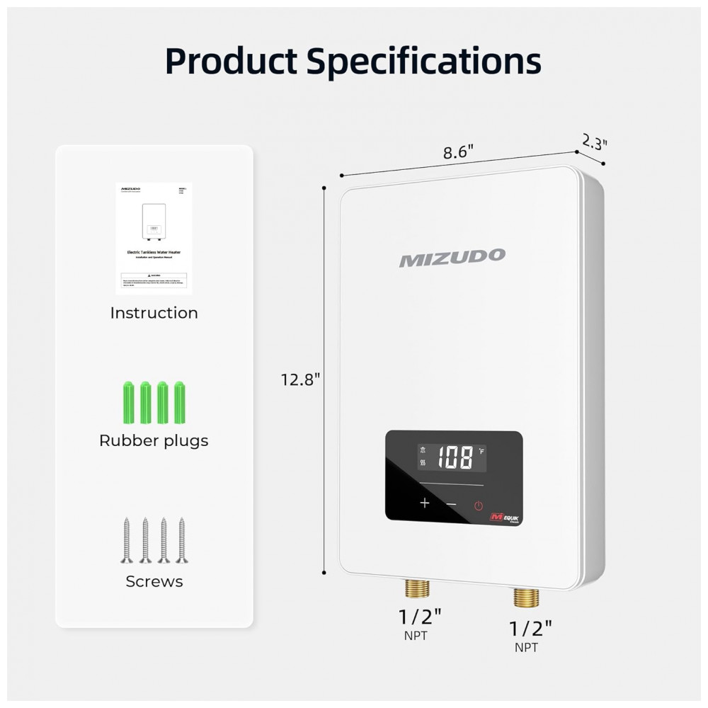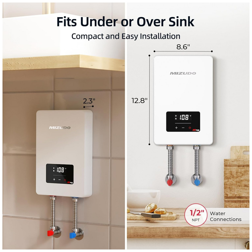 Aquecedor tanque zero elétrico MIZUDO 6.5kW 240V atende uso pontual em 1 ponto simultâneo, com vazão máxima de 1,5 GPM (5,7 L/min). Display LED permite ajuste de temperatura entre 30°C e 60°C, com regulação precisa via chip que ajusta 20.000 vezes por segundo para estabilidade de ±0,5°C. Requer disjuntor duplo 30A, fios 10 AWG e conexões NPT 1/2″, ideal para instalação compacta sob pias ou em cozinhas.