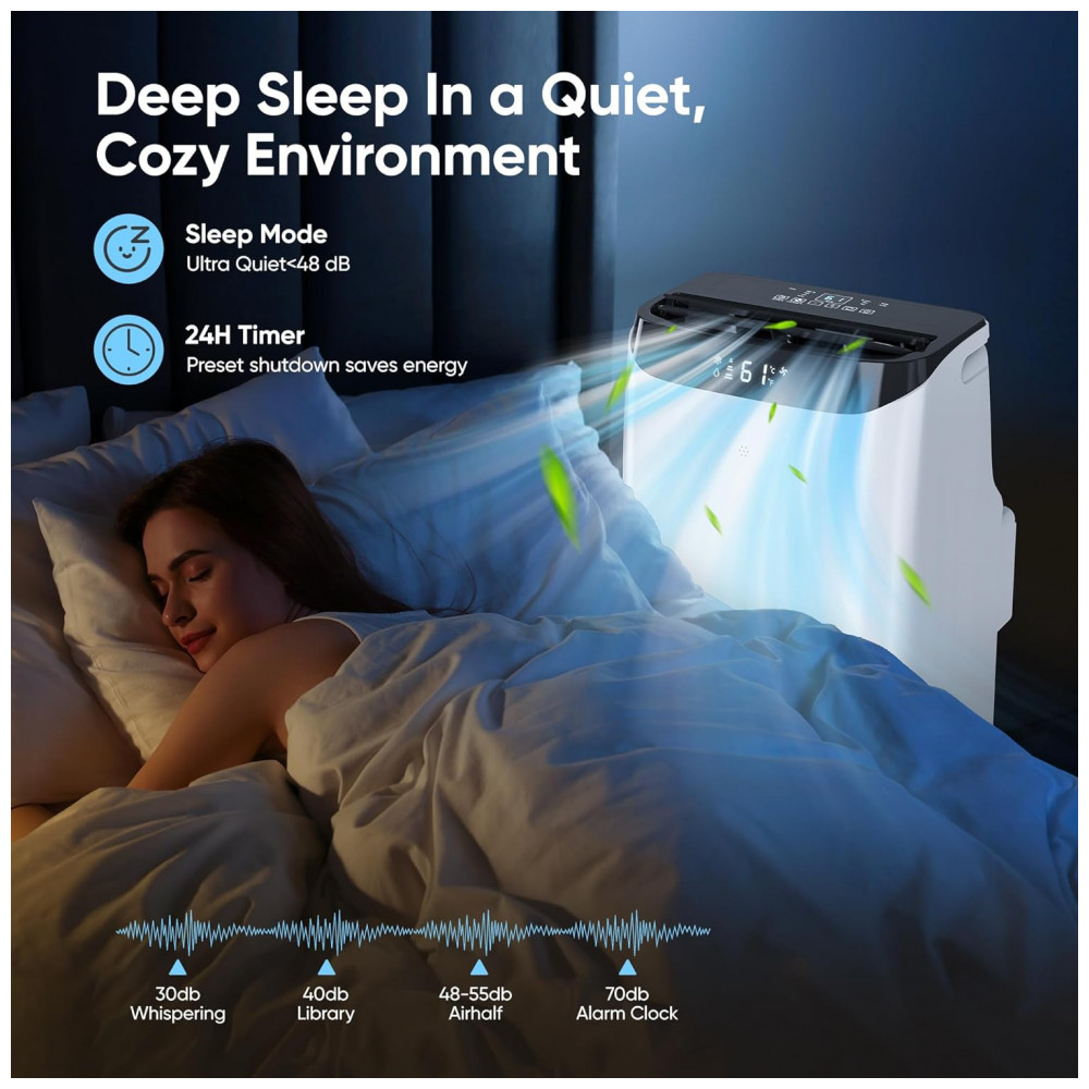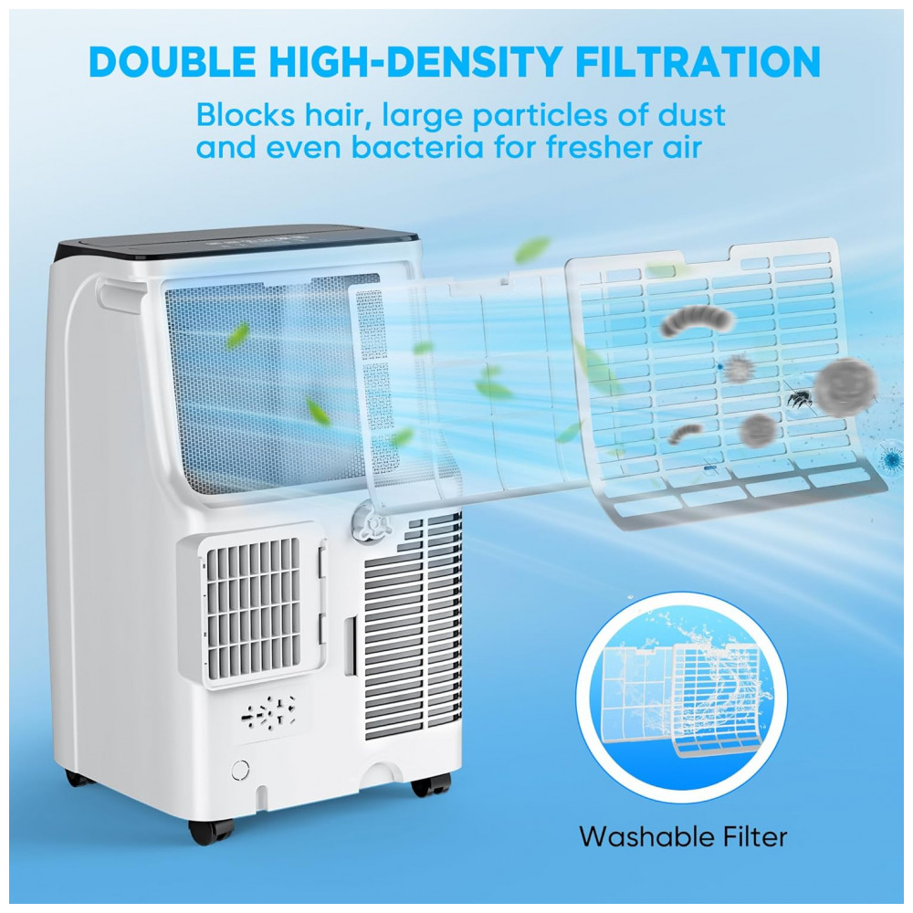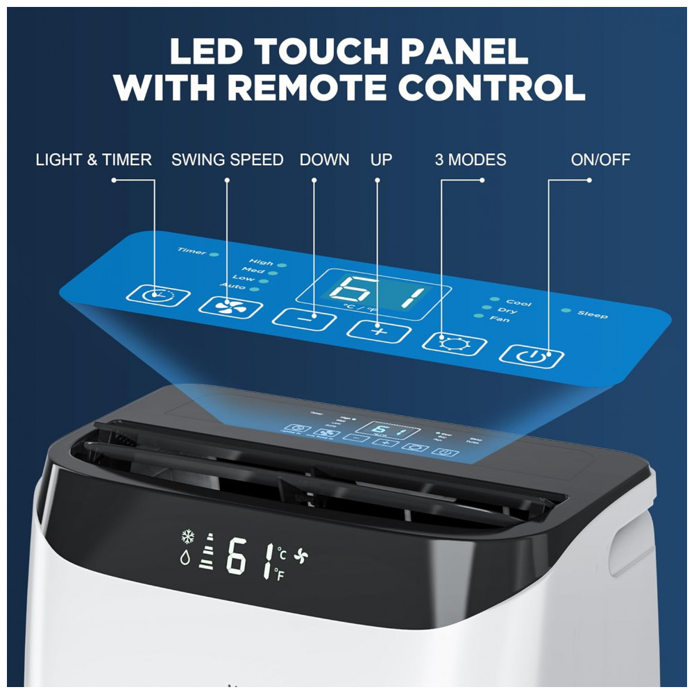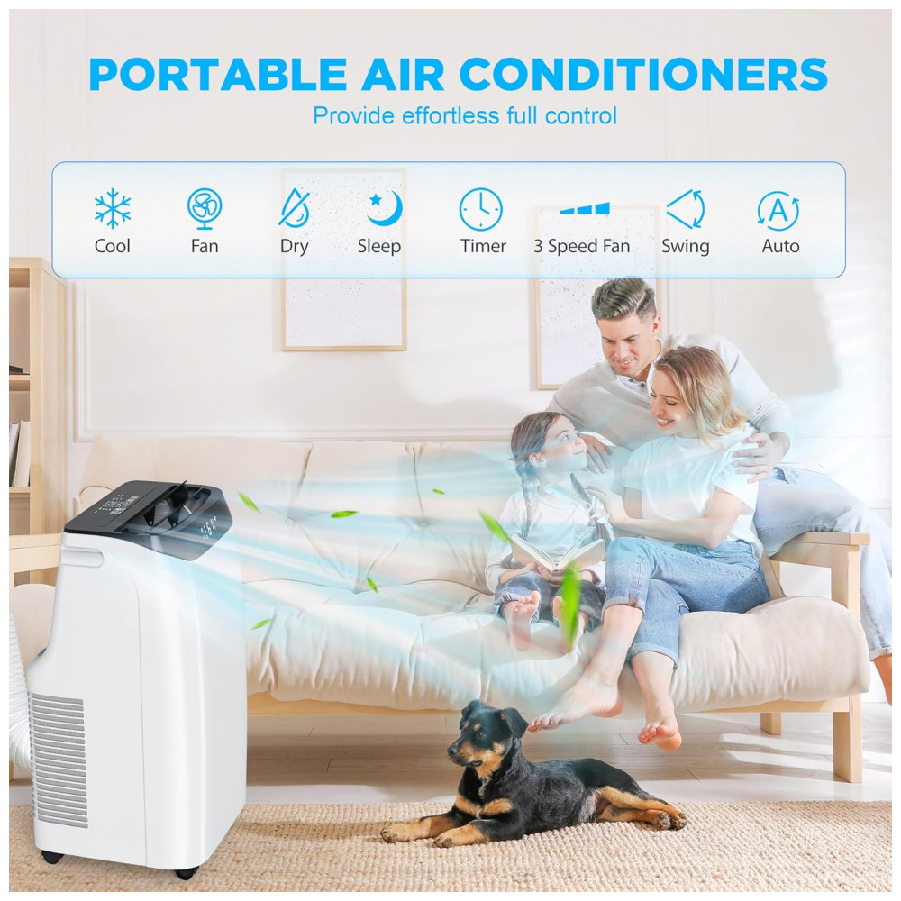 Desfrute de um ambiente fresco e agradável com o Ar-Condicionado Portátil DOMANKI de 12.000 BTUs. Com sistema de refrigeração eficiente, este aparelho portátil certificado pela ETL pode refrigerar áreas de até 46 m². Equipado com múltiplas funções inteligentes, como oscilação automática, timer de 24 horas, modo sleep, trava de segurança, múltiplas velocidades de ventilador e modos de resfriamento, desumidificação e ventilação, tornando-o uma solução simples e completa. Fácil de usar e conveniente, possui rodízios para mobilidade, filtro removível e lavável para manter a qualidade do ar interno e kit de instalação completo para janelas deslizantes verticais e horizontais. Com sensores inteligentes, display digital, controle remoto e funcionamento silencioso, ideal para diversos ambientes como escritórios, quartos grandes e até mesmo campervans.