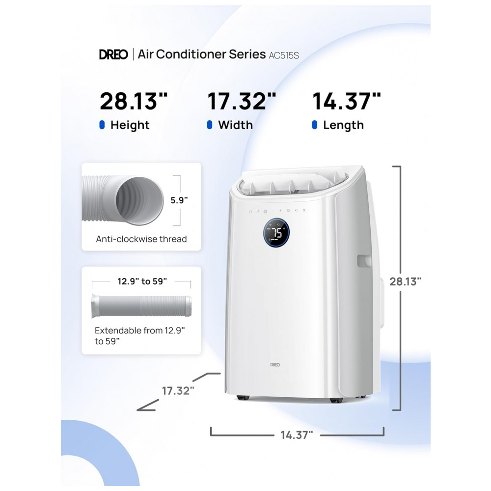 O ar-condicionado portátil DREO AC515S traz uma enorme capacidade de resfriamento de 12.000 BTU de acordo com a ASHRAE, alcançando até 4,88 metros. Ajuda a manter uma temperatura confortável nos dias quentes de verão. Além disso, você pode manter a temperatura entre 18°C e 30°C usando vários controles para personalizar o resfriamento de acordo com suas preferências. Tenha mais controle sobre a forma como você resfria, graças ao modo 3 em 1 que inclui configurações para resfriamento, desumidificação e controle do ventilador em um único aparelho, encontrar a configuração de conforto ideal é mais fácil do que nunca com o ar-condicionado DREO. Com um novo sistema de isolamento de ruído ao redor do compressor, este ar-condicionado portátil reduz o ruído para um mínimo de 46dB, tornando-o ideal para locais silenciosos como quartos e escritórios. Este ar-condicionado portátil com autoevaporação combina um evaporador e uma bomba de alta capacidade para reduzir as necessidades de drenagem em 90% em comparação com unidades tradicionais. Um tubo de drenagem incluído é necessário para ambientes com umidade acima de 85%. Use seu assistente de voz favorito compatível com Amazon Alexa ou Google Home ou o aplicativo completo da Dreo para controlar todos os aspectos da sua experiência de resfriamento, desde múltiplos modos até velocidades do ventilador, temporizadores e programações, este ar-condicionado de chão tem tudo.