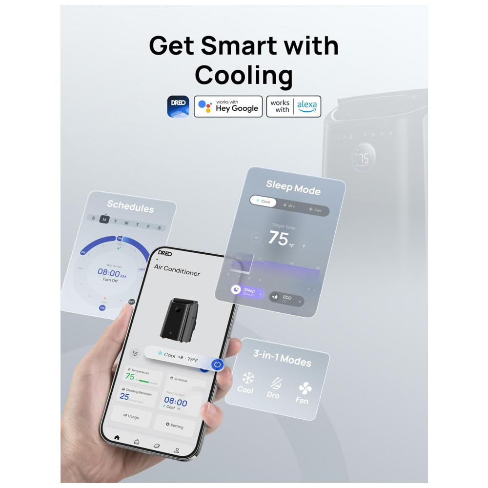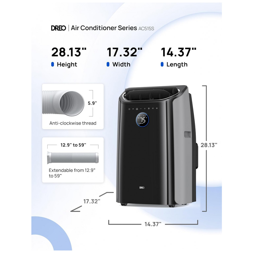 O ar-condicionado portátil Dreo AC515S traz uma capacidade de refrigeração maciça de 12.000 BTU ASHRAE, que alcança até 4,88 metros. Ajudando você a manter a temperatura confortável nos dias quentes de verão. Além disso, você pode manter a temperatura entre 18,3°C a 30°C usando diferentes controles para personalizar a refrigeração de acordo com suas preferências. Tenha mais controle sobre a forma como refrigera graças ao modo 3 em 1, incluindo configurações para refrigeração, desumidificação e controle de ventilador em um único aparelho, facilitando mais do que nunca a busca da configuração de conforto ideal com o ar-condicionado Dreo. Com um novo sistema de isolamento de ruído em torno do compressor, este ar-condicionado portátil reduz o ruído para um mínimo de 46dB, tornando-o ideal para lugares silenciosos como quartos e escritórios. Este ar-condicionado portátil com autoevaporação em ambiente combina um evaporador e uma bomba de alta capacidade para reduzir as necessidades de drenagem em 90% em comparação com unidades tradicionais. A mangueira de drenagem incluída é necessária para ambientes com umidade acima de 85%. Use seu assistente de voz favorito compatível com Amazon Alexa ou Google Home, ou o aplicativo Dreo completo para controlar todos os aspectos de sua experiência de refrigeração, desde múltiplos modos até velocidades de ventilador, temporizadores e programações, este ar-condicionado de chão tem tudo.