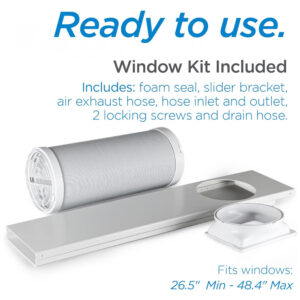 Componentes Inclusos: Kit de Instalação: Mangueira de exaustão de ar, adaptadores de entrada/saída de mangueira, guarnição de janela, mangueira de drenagem e manual do proprietário, e Controle remoto completo,