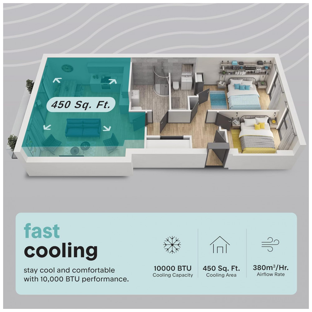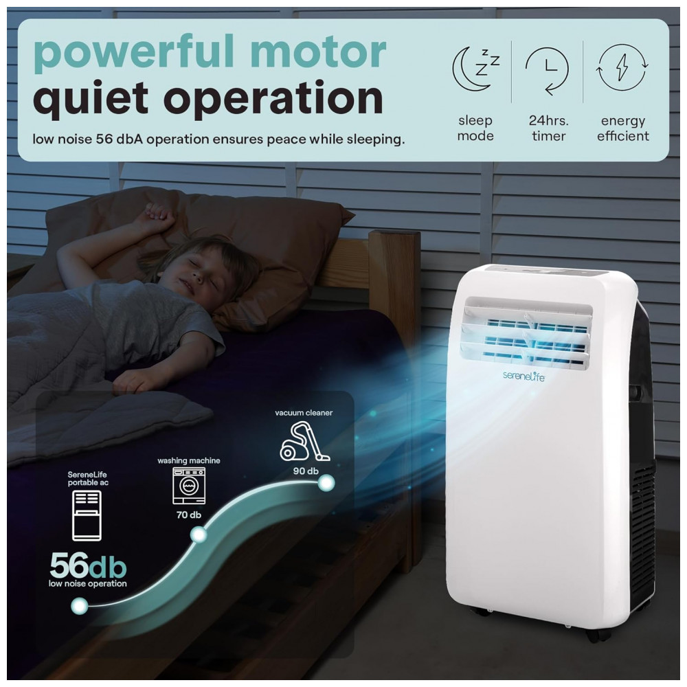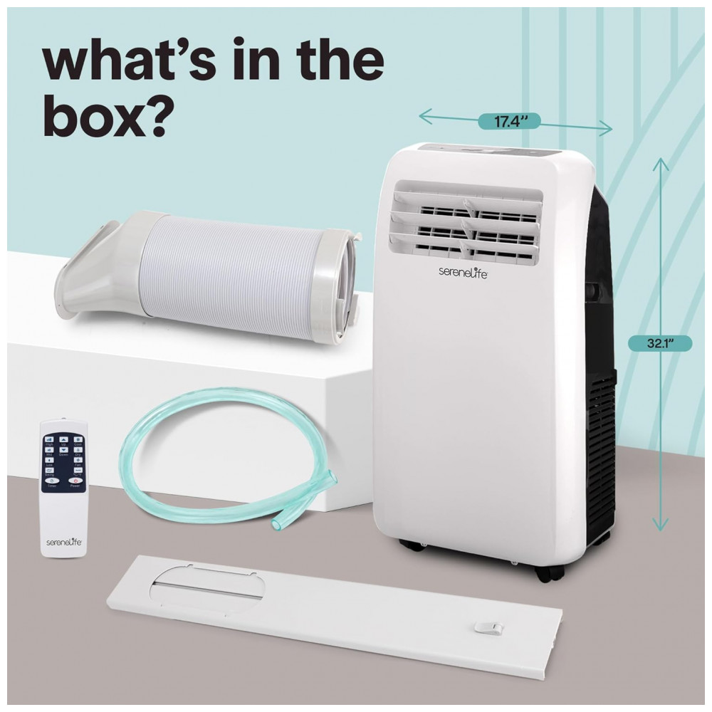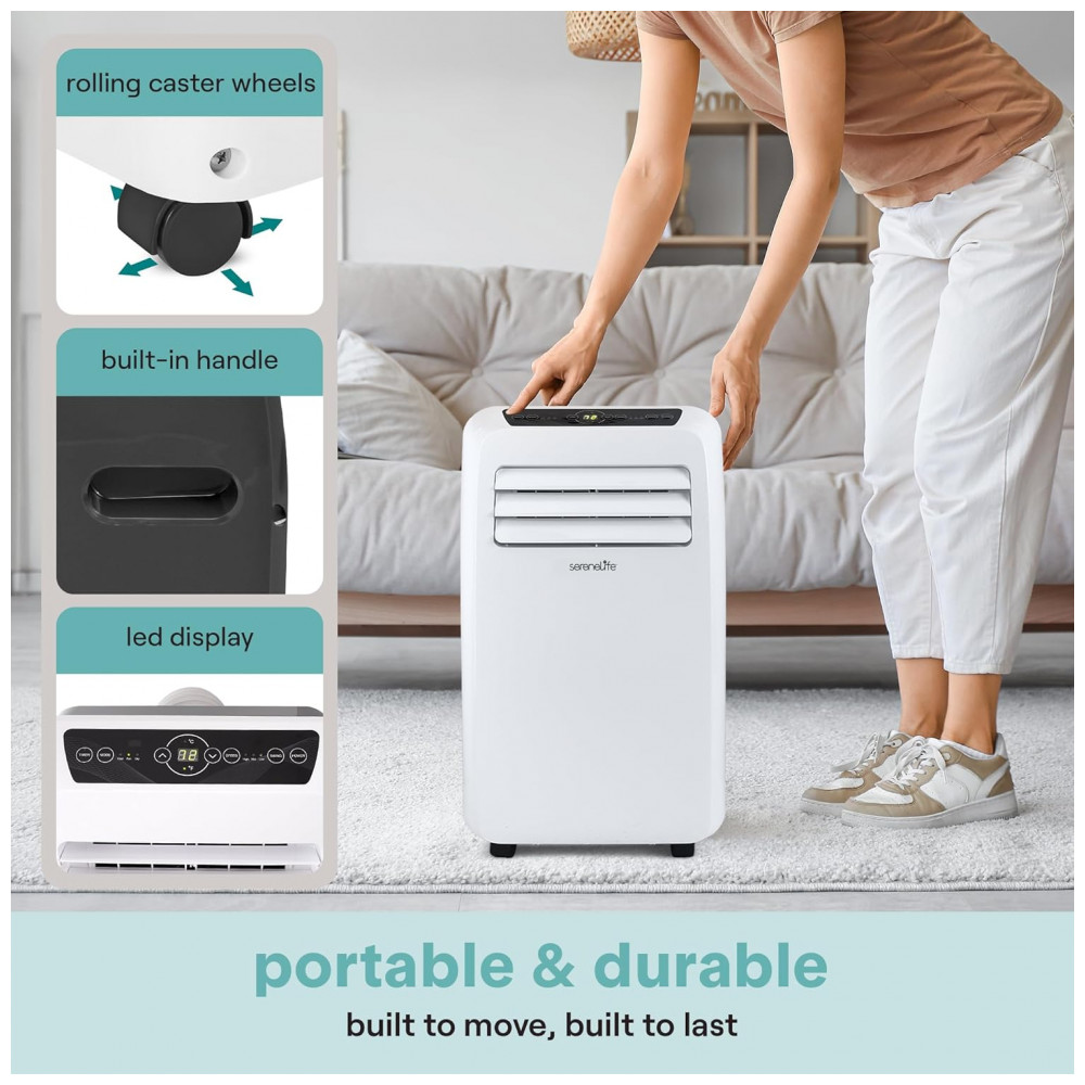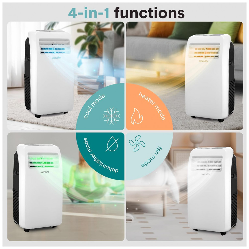 O Ar-condicionado Portátil SereneLife apresenta um design leve, compacto e elegante, ideal para uso no quarto, sala ou garagem em casa ou no escritório. Possui rodas para fácil portabilidade. Além de refrigerar, o ar-condicionado também ajuda a reduzir os níveis de umidade, proporcionando economia de espaço e financeira. Com 4 modos operacionais (refrigeração, aquecimento, desumidificação e ventilação), controle remoto, função de oscilação automática e capacidade para cobrir uma área de até 42m². Ideal para uso durante todo o ano, com potência de resfriamento de 10.000 BTU (ASHRAE), potência de aquecimento de 9.000 BTU e remoção de umidade de 15 litros por hora, mantendo um nível de ruído baixo de apenas 56 dBa.