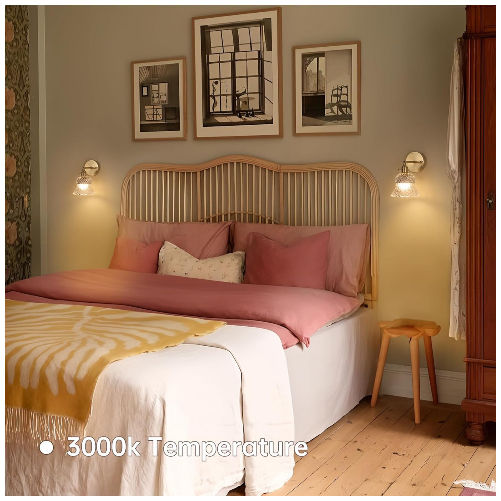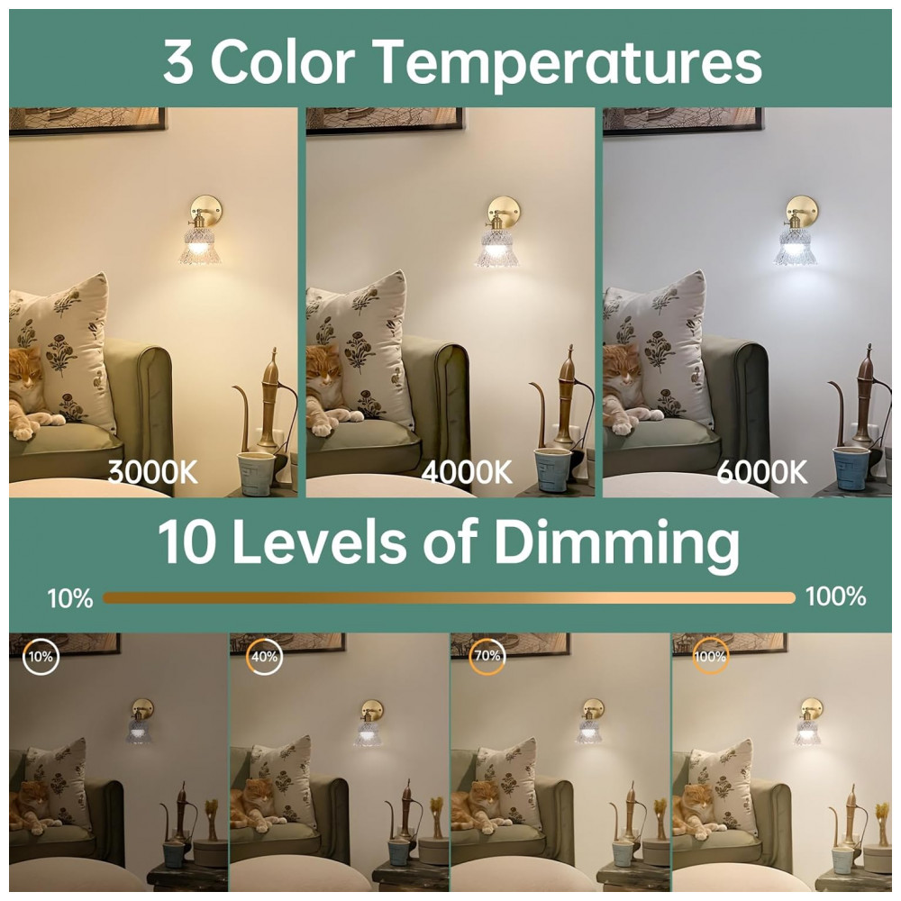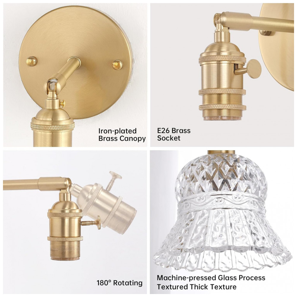 O conjunto de arandelas Shenmoyl sem fio combina base em metal com acabamento polido em latão e cúpula de vidro transparente em formato abacaxi, criando pontos de luz decorativos para cabeceiras, salas, cozinhas e corredores sem necessidade de fiação elétrica fixa na parede. Cada peça é instalada por fixação em parede, com soquete padrão E26 e lâmpada LED recarregável controlada por controle remoto, indicada para uso em ambientes internos secos.