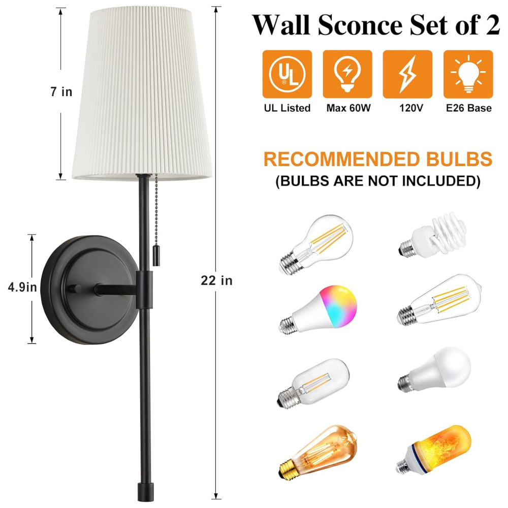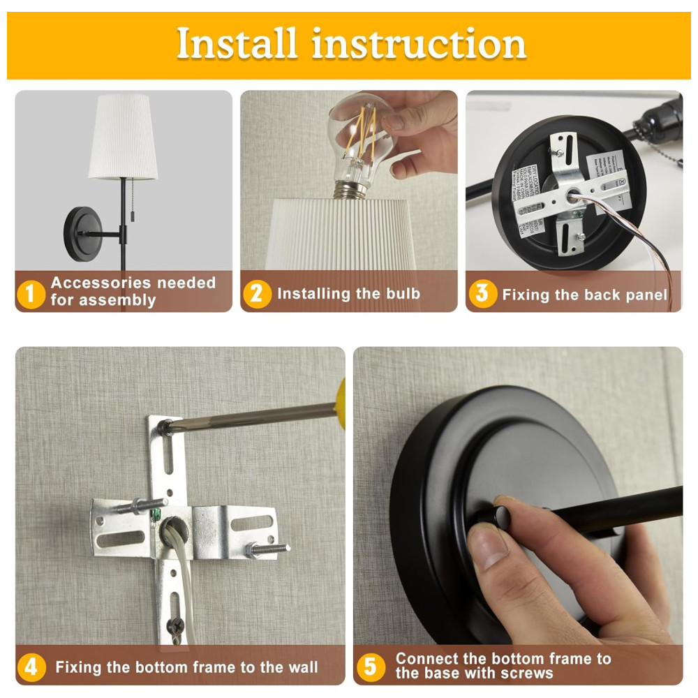 Você pode escolher a posição e altura da instalação de acordo com suas necessidades reais. As lâmpadas devem ter base padrão E26 dos EUA com certificação UL e serem compatíveis com qualquer tipo de lâmpada E26 MÁX de 60 W, como Edison, incandescente, halógena, LED ou CFL. Lâmpadas não estão incluídas.