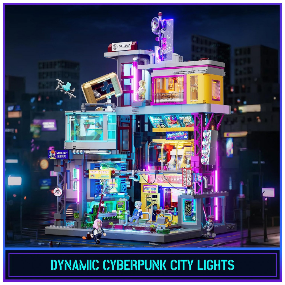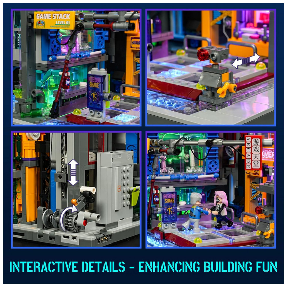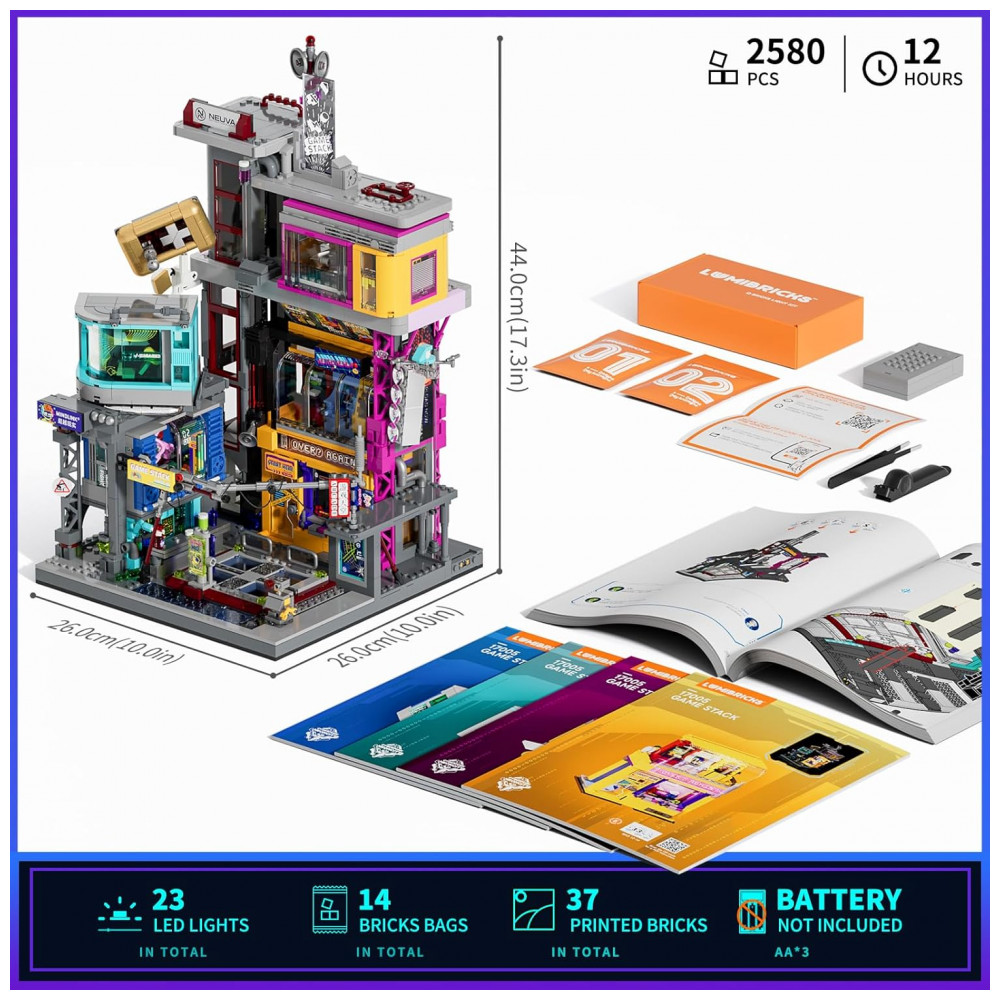 O kit Lumibricks Arcade Cyberpunk Game Stack contém 2580 peças plásticas ABS que formam um complexo de entretenimento vertical em múltiplos níveis, seguindo a filosofia urbana cyberpunk com módulos intercambiáveis: zona de jogos retrô, cápsula VR de combate, cápsula interface cérebro-computador e cápsula de prêmios, permitindo sequências de montagem flexíveis por módulo.
