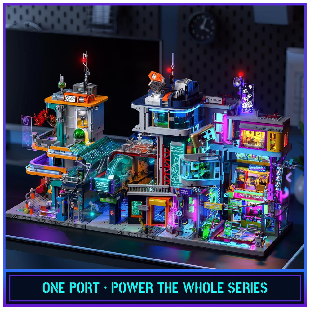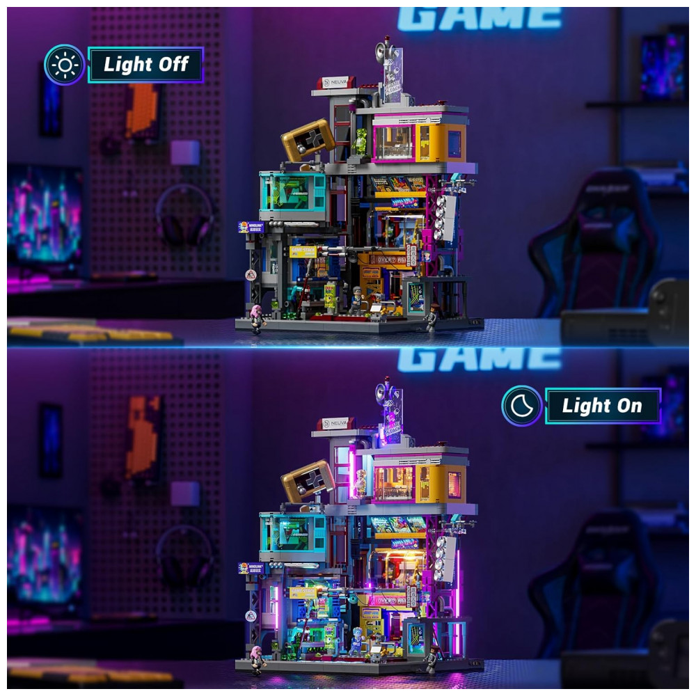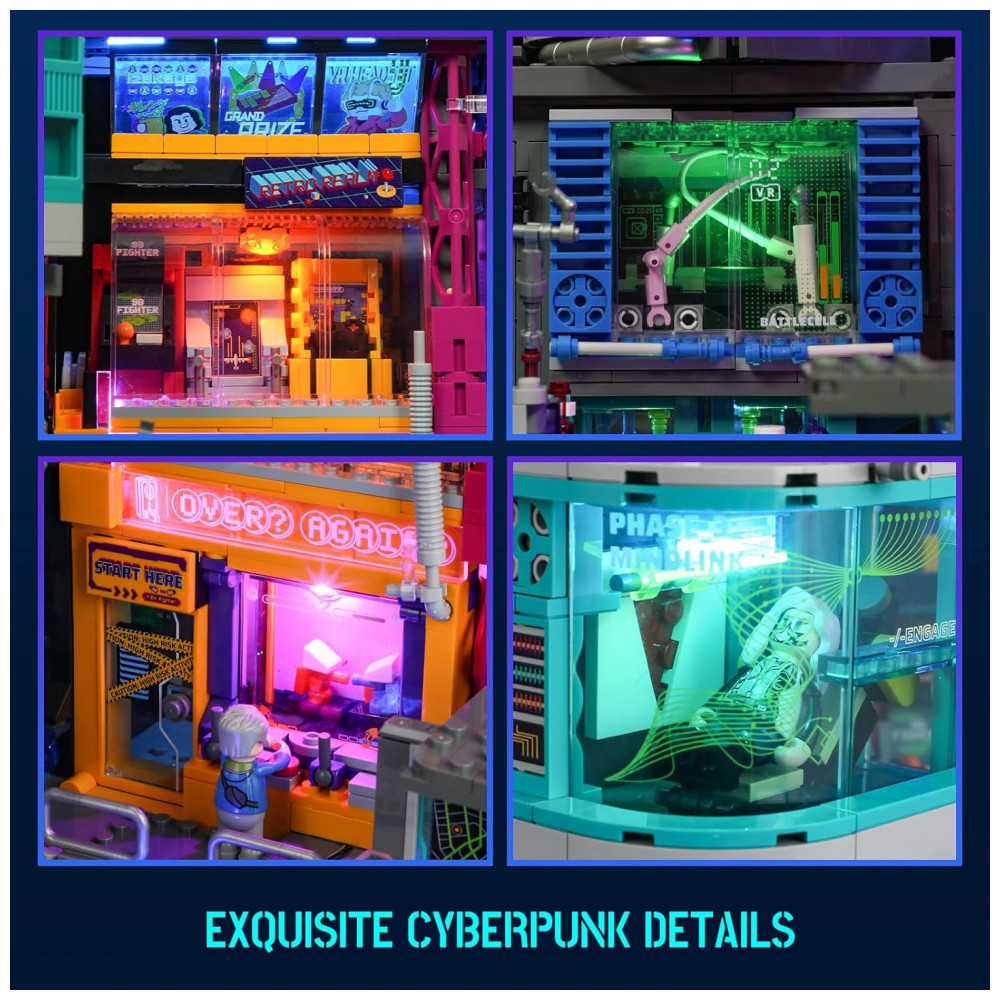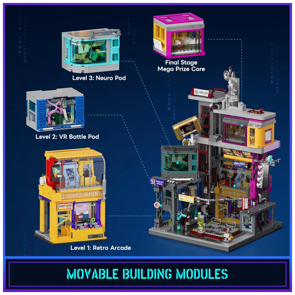O kit Lumibricks Arcade Cyberpunk Game Stack contém 2580 peças plásticas ABS que formam um complexo de entretenimento vertical em múltiplos níveis, seguindo a filosofia urbana cyberpunk com módulos intercambiáveis: zona de jogos retrô, cápsula VR de combate, cápsula interface cérebro-computador e cápsula de prêmios, permitindo sequências de montagem flexíveis por módulo.