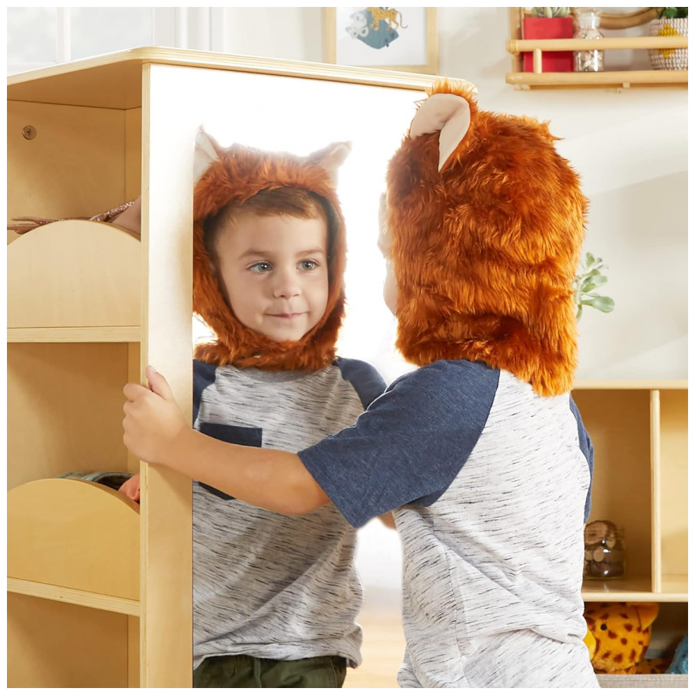 Dois espelhos longitudinais em Mylar, embutidos nas laterais, permitem que as crianças visualizem o figurino completo na altura adequada, reforçando o uso do móvel como estação de fantasia. A construção em madeira com acabamento em textura de madeira (wood grain) é lixada para bordas suaves e recebe revestimento atóxico projetado para minimizar riscos e marcas de uso, adequada ao manuseio frequente em ambientes infantis.