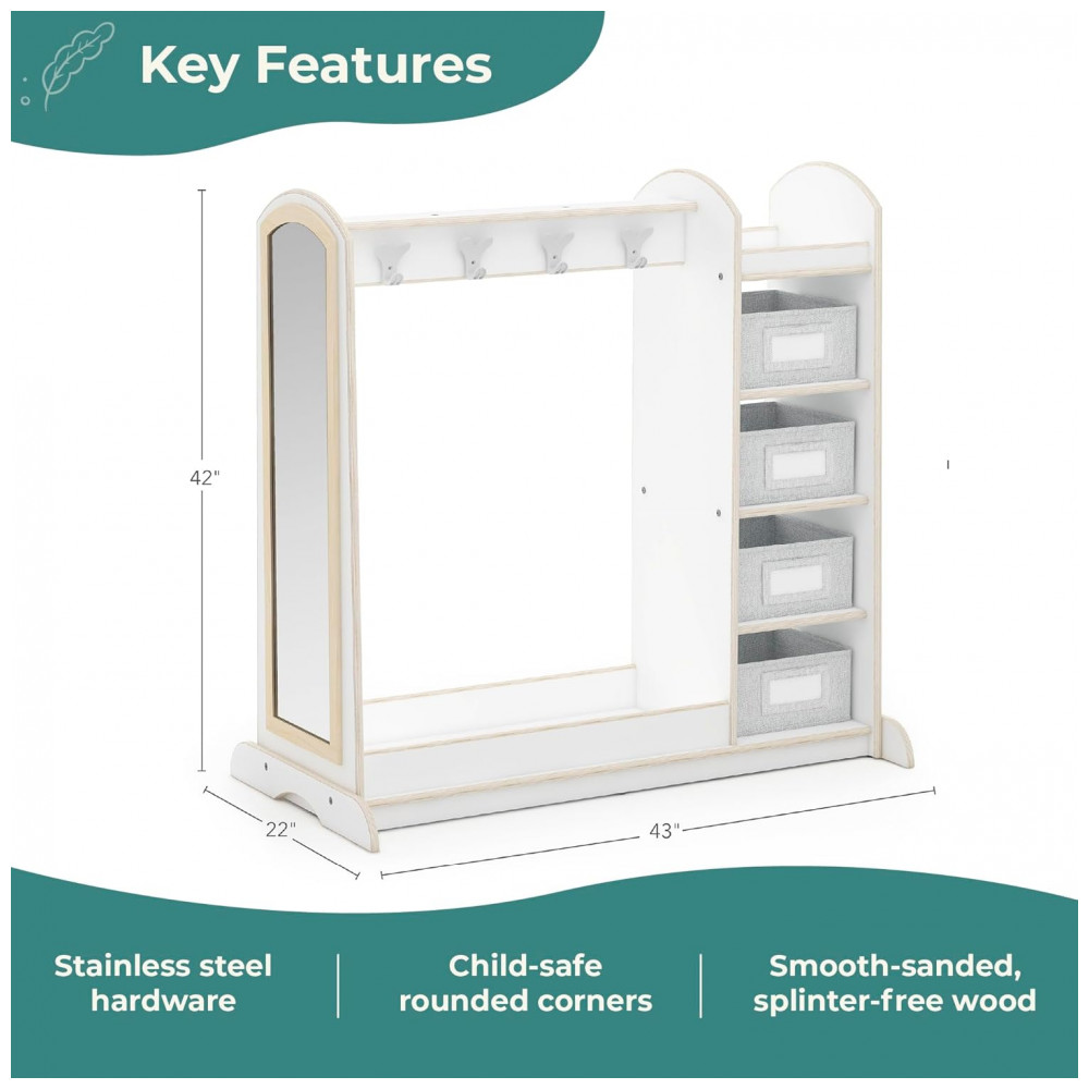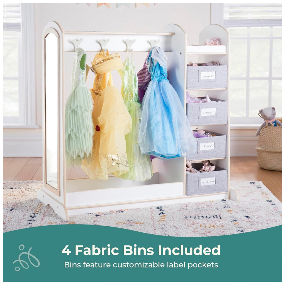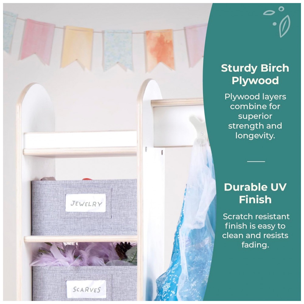 Armário infantil Guidecraft EdQ Dress-up Storage branco com espelho cabideiro ganchos e 4 caixas organizadoras em tecido