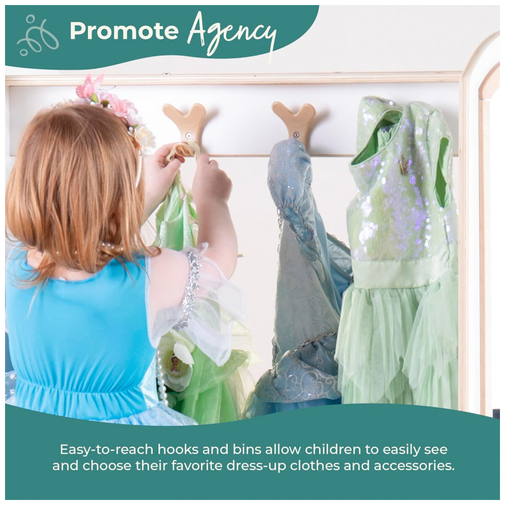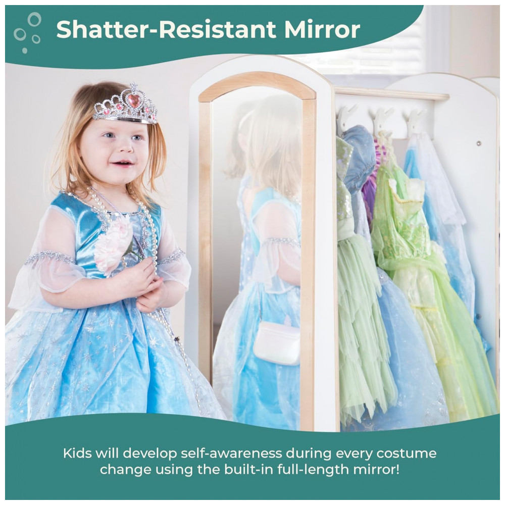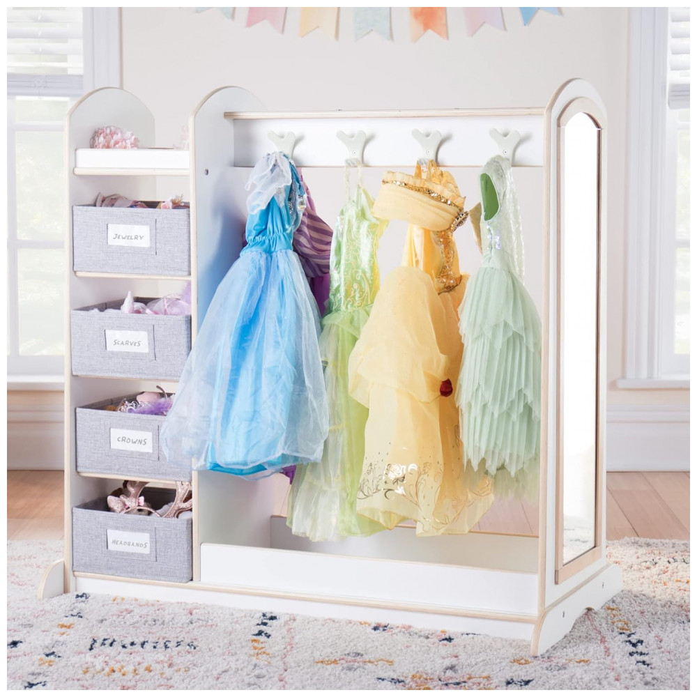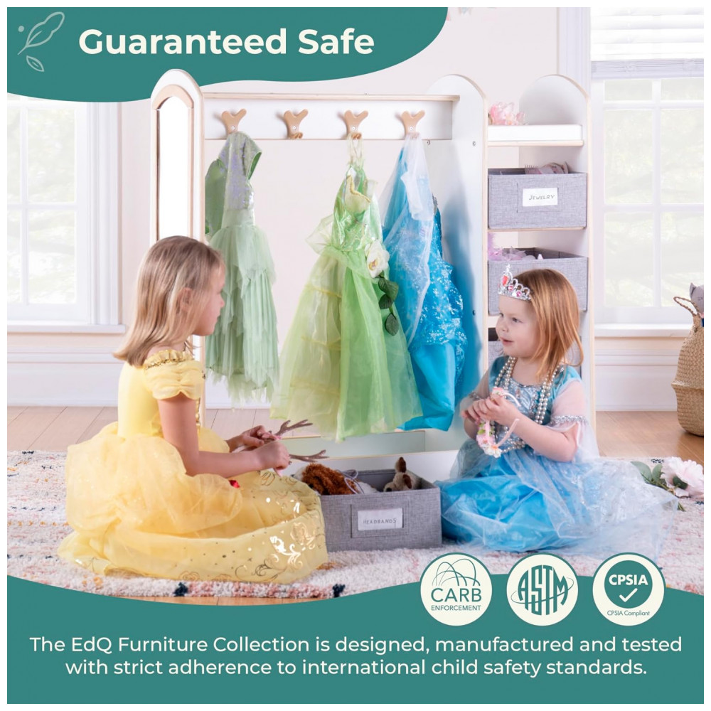 Armário infantil Guidecraft EdQ Dress-up Storage branco com espelho cabideiro ganchos e 4 caixas organizadoras em tecido