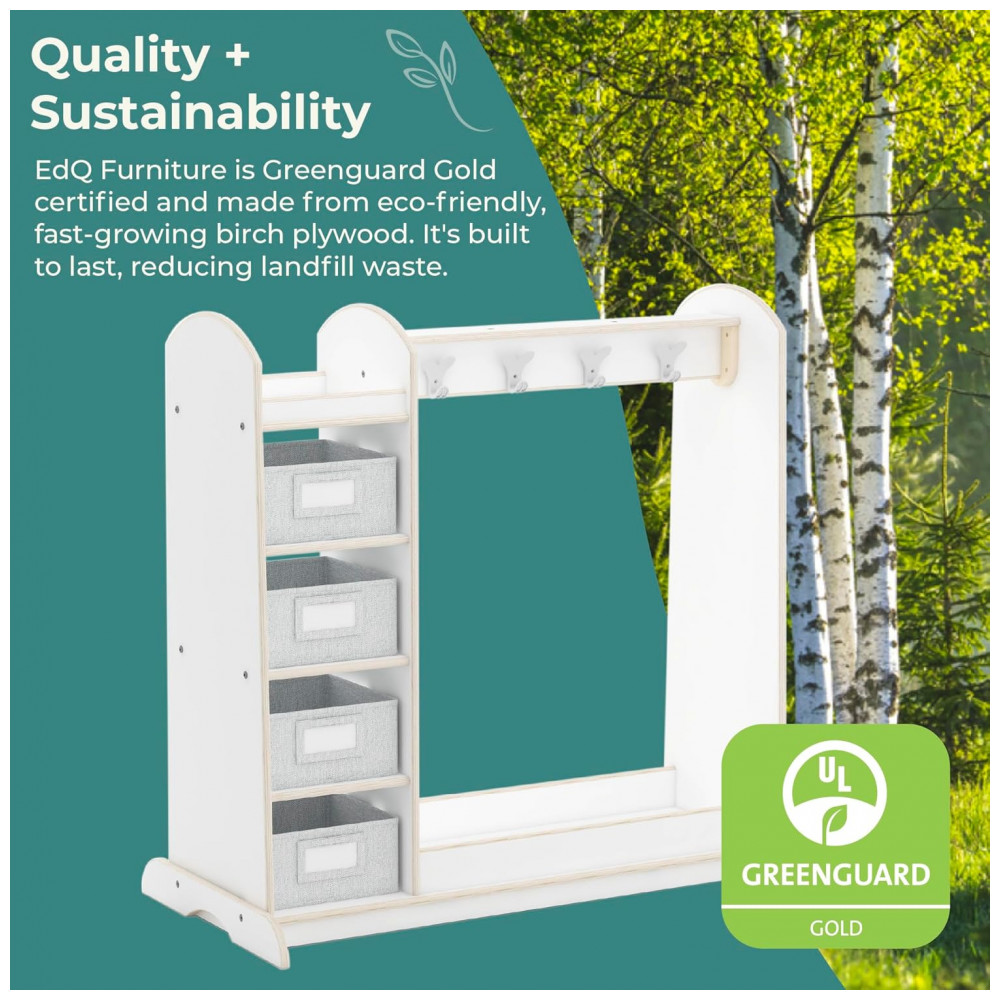 O armário infantil Guidecraft EdQ Essentials Dress-up Storage em branco foi desenvolvido para organizar fantasias, roupas de brincar, sapatos e acessórios em quartos infantis, brinquedotecas e salas de aula. A estrutura em madeira multilaminada de bétula com pintura de fácil limpeza e cantos arredondados oferece segurança e resistência para uso frequente no ambiente infantil.