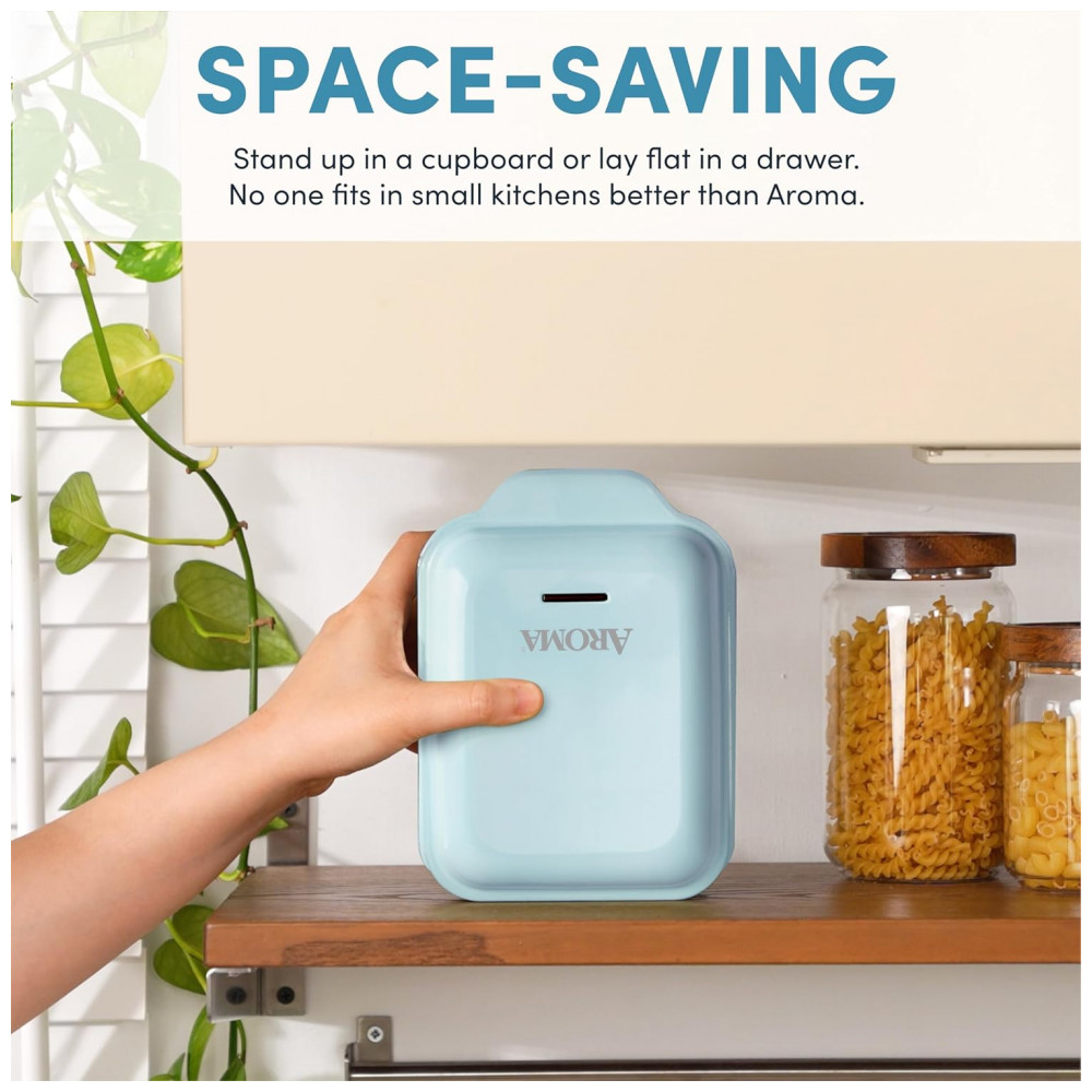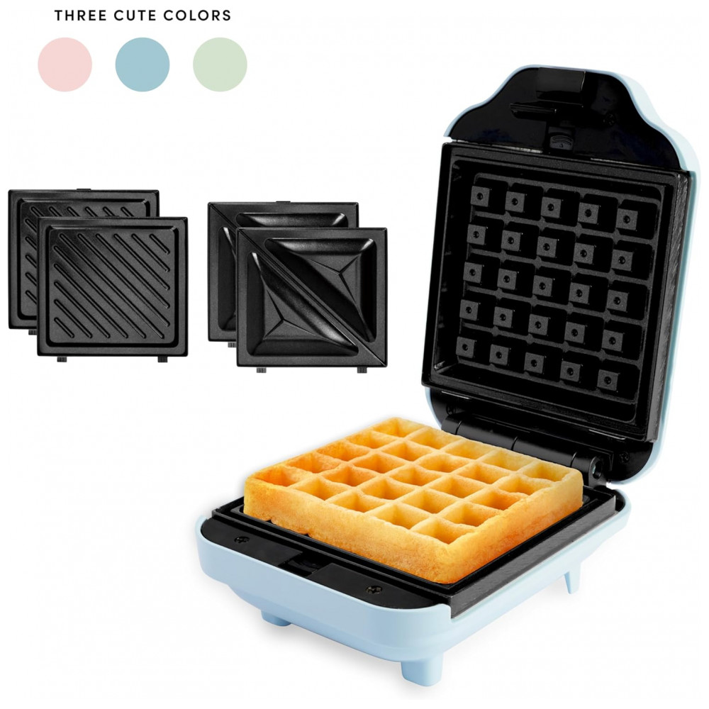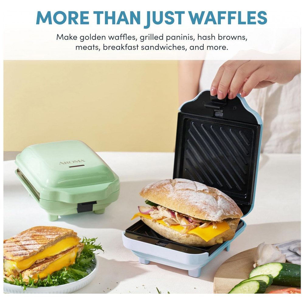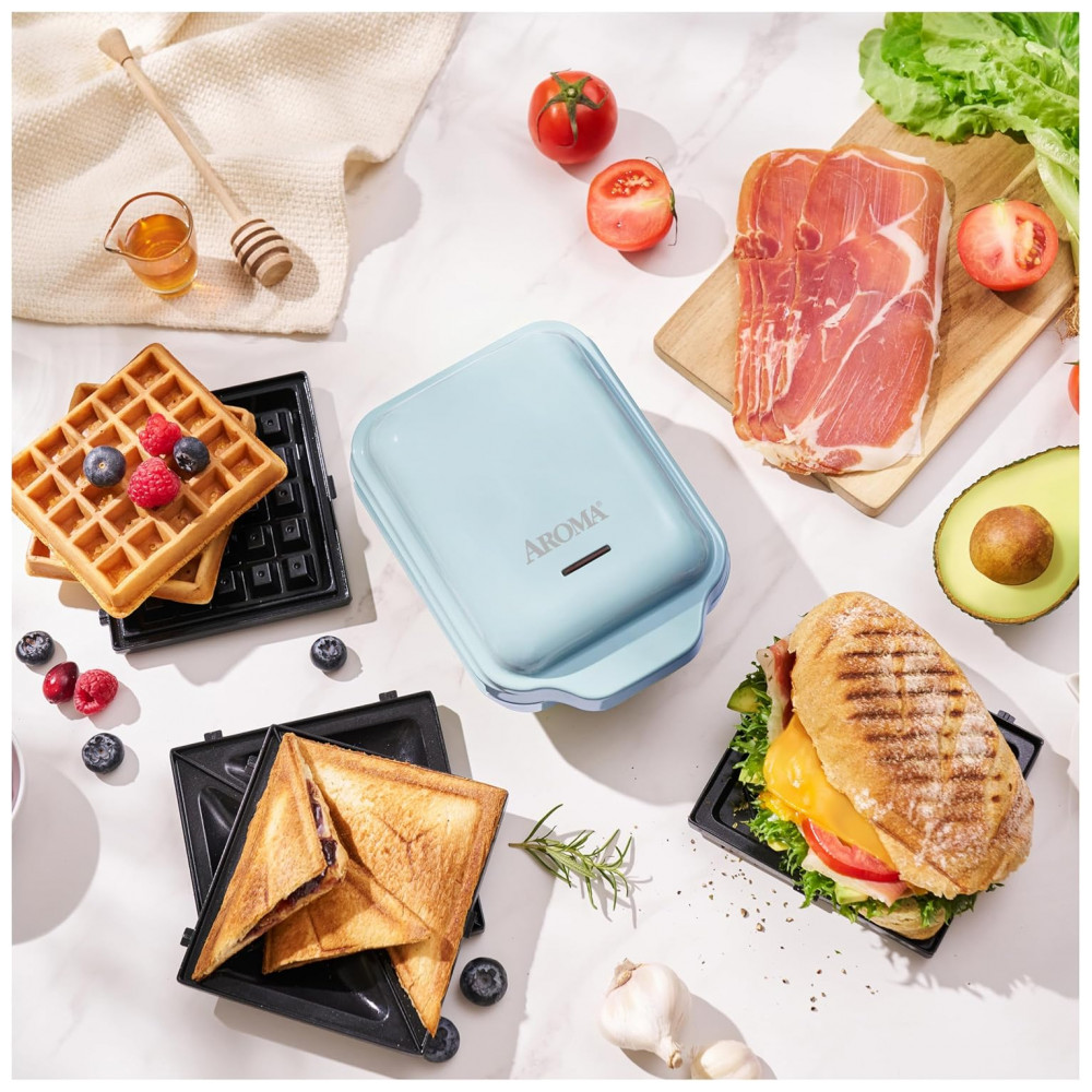 AROMA 3-em-1 Prensa Panini Grelhador Sanduíche e Máquina de Waffles Azul 120V Placas Removíveis