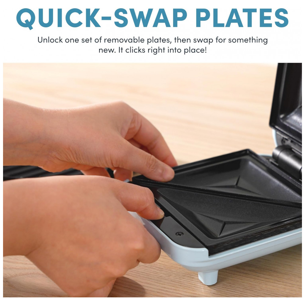 Aquecimento rápido com 600W distribui calor uniformemente. Placas intercambiáveis desbloqueiam em segundos para waffles clássicos, prensas panini ou grelhados. Superfície antiaderente requer spray mínimo de óleo.
