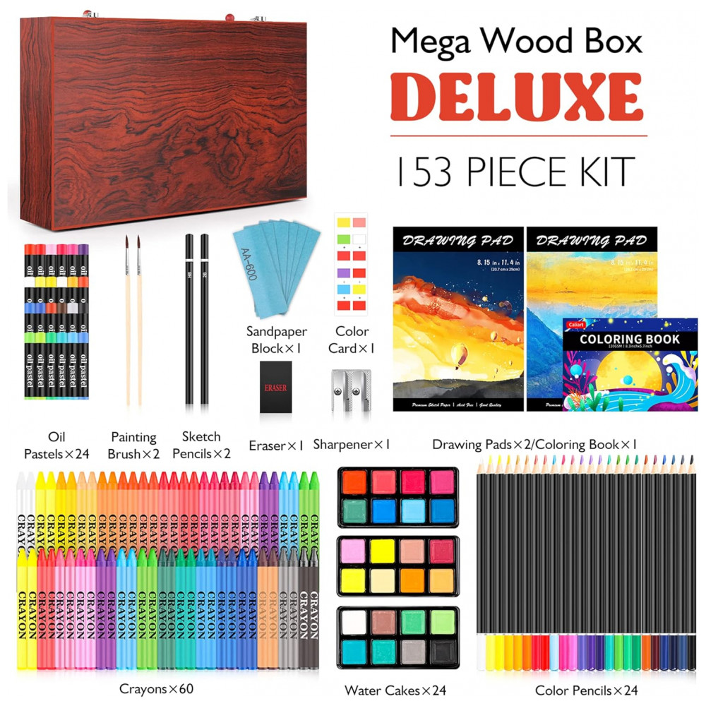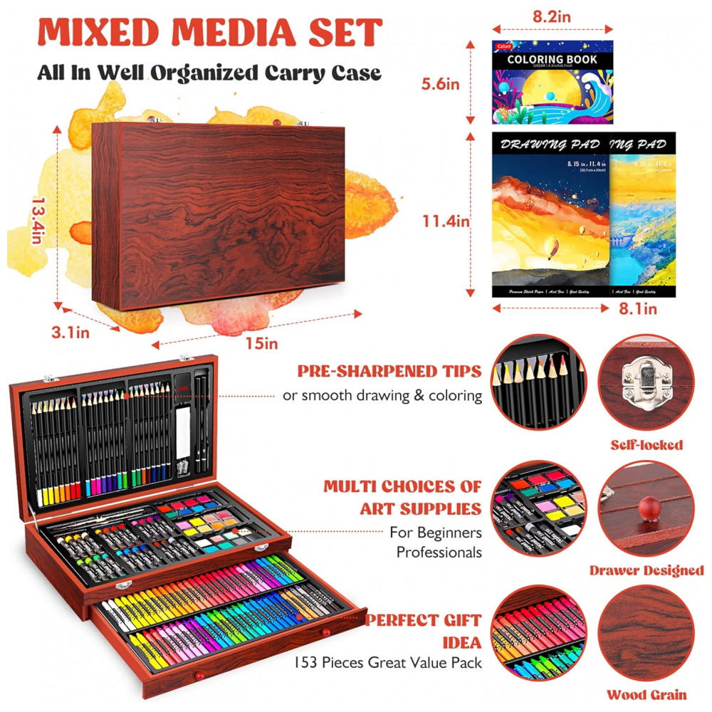 Art Supplies Kit Lápis de Cor Profissional com Maleta de Madeira 153 peças Tintas Acrílicas Aquarela CALIART Marrom